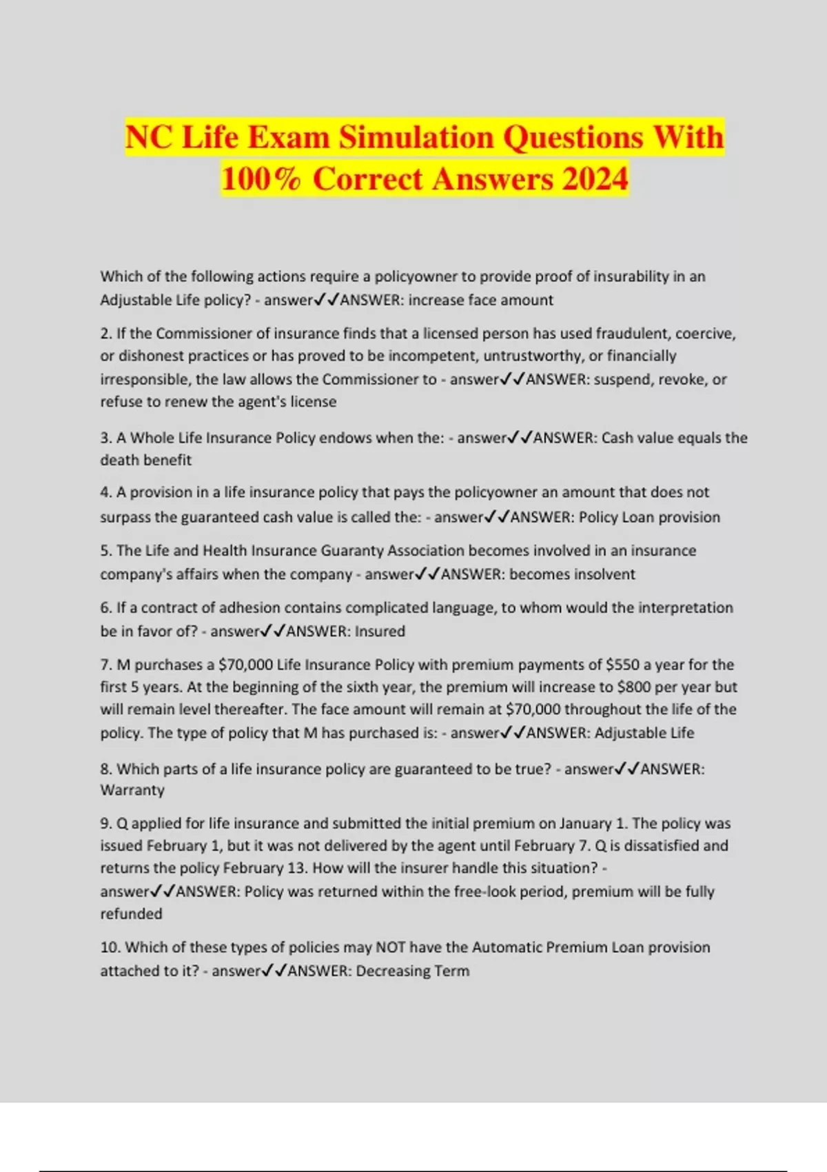 NC Life Exam Simulation Questions With 100% Correct Answers 2024 Which of the following actions require a policyowner to provide proof of insurability in an Adjustable Life policy? - answerANSWER: increase face amount 2. If the Commissioner of insurance finds that a licensed person has used fraudulent, coercive, or dishonest practices or has proved to be incompetent, untrustworthy, or financially irresponsible, the law allows the Commissioner to - answerANSWER: suspend, revoke, or refuse to renew the agent's license 3. A Whole Life Insurance Policy endows when the: - answerANSWER: Cash value equals the death benefit 4. A provision in a life insurance policy that pays the policyowner an amount that does not surpass the guaranteed cash value is called the: - answerANSWER: Policy Loan provision 5. The Life and Health Insurance Guaranty Association becomes involved in an insurance company's affairs when the company - answerANSWER: becomes insolvent 6. If a contract of adhesion contains complicated language, to whom would the interpretation be in favor of? - answerANSWER: Insured 7. M purchases a $70,000 Life Insurance Policy with premium payments of $550 a year for the first 5 years. At the beginning of the sixth year, the premium will increase to $800 per year but will remain level thereafter. The face amount will remain at $70,000 throughout the life of the policy. The type of policy that M has purchased is: - answerANSWER: Adjustable Life 8. Which parts of a life insurance policy are guaranteed to be true? - answerANSWER: Warranty 9. Q applied for life insurance and submitted the initial premium on January 1. The policy was issued February 1, but it was not delivered by the agent until February 7. Q is dissatisfied and returns the policy February 13. How will the insurer handle this situation? - answerANSWER: Policy was returned within the free-look period, premium will be fully refunded 10. Which of these types of policies may NOT have the Automatic Premium Loan provision attached to it? - answerANSWER: Decreasing Term 11. Which of the following consists of an offer, acceptance, and consideration? - answerANSWER: Contract 12. According to North Carolina's rules on disclosure, a life insurance applicant is expected to be provided with - answerANSWER: a Buyer's Guide and Policy Summary 13. Which of the following statements about noncontributory employee group life insurance is FALSE? - answerANSWER: A minimum number of employees is required to participate 14. The automatic premium loan provision is designed to: - answerANSWER: avoid a policy lapse 15. The amount received for a life insurance policy in a viatical settlement is - answerANSWER: Less than the death benefit 16. If after satisfactory proof of loss, an insurer fails or refuses to pay death proceeds, the insurer must pay interest on the proceeds after how many days? - answerANSWER: 30 17. When a life insurance policy exceeds certain IRS table values, the result would create which of the following? - answerANSWER: Modified Endowment Contract (MEC) 18. A written agreement to provide a Life Insurance Policy holder immediate cash in exchange for the sale and transfer of a Life Insurance Policy is a - answerANSWER: Viatical Settlement 19. The annuity that represents the largest possible monthly payment to an individual annuitant is a(n): - answerANSWER: Straight Life annuity 20. The fund that assures policyholders payment of death benefits on Life Policies, if the company is insolvent at the time of the claim, is called the - answerANSWER: Life and Health Insurance Guaranty Association 21. The most important factor to consider when determining whether to convert term insurance at the insured's attained age or the insured's original age is: - answerANSWER: the cost 22. Which of these is NOT considered to be an element of an insurance contract? - answerANSWER: negotiating 23. J is 35-years old and looking to purchase a whole life insurance policy. Which of the following types of policies will provide the most rapid growth of cash value? - answerANSWER: 20-pay Life 24. A trustee-to-trustee transfer of rollover funds in a qualified plan allows a participant to avoid: - answerANSWER: mandatory income tax withholding o