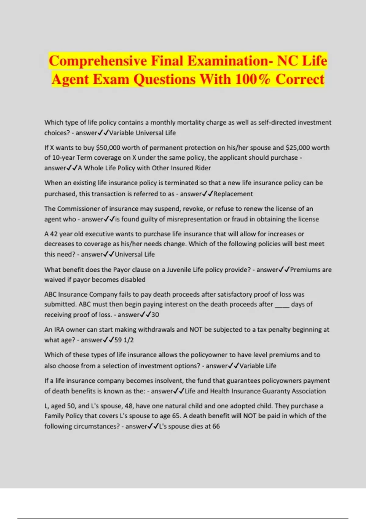Comprehensive Final Examination- NC Life Agent Exam Questions With 100% Correct Which type of life policy contains a monthly mortality charge as well as self-directed investment choices? - answerVariable Universal Life If X wants to buy $50,000 worth of permanent protection on his/her spouse and $25,000 worth of 10-year Term coverage on X under the same policy, the applicant should purchase - answerA Whole Life Policy with Other Insured Rider When an existing life insurance policy is terminated so that a new life insurance policy can be purchased, this transaction is referred to as - answerReplacement The Commissioner of insurance may suspend, revoke, or refuse to renew the license of an agent who - answeris found guilty of misrepresentation or fraud in obtaining the license A 42 year old executive wants to purchase life insurance that will allow for increases or decreases to coverage as his/her needs change. Which of the following policies will best meet this need? - answerUniversal Life What benefit does the Payor clause on a Juvenile Life policy provide? - answerPremiums are waived if payor becomes disabled ABC Insurance Company fails to pay death proceeds after satisfactory proof of loss was submitted. ABC must then begin paying interest on the death proceeds after ____ days of receiving proof of loss. - answer30 An IRA owner can start making withdrawals and NOT be subjected to a tax penalty beginning at what age? - answer59 1/2 Which of these types of life insurance allows the policyowner to have level premiums and to also choose from a selection of investment options? - answerVariable Life If a life insurance company becomes insolvent, the fund that guarantees policyowners payment of death benefits is known as the: - answerLife and Health Insurance Guaranty Association L, aged 50, and L's spouse, 48, have one natural child and one adopted child. They purchase a Family Policy that covers L's spouse to age 65. A death benefit will NOT be paid in which of the following circumstances? - answerL's spouse dies at 66 Which type of life insurance beneficiary requires his/her consent when a change of beneficiary is attempted by the policyowner? - answerIrrevocable Beneficiary Which provision allows the policyowner to change a term life policy to a permanent one without providing proof of good health? - answerConversion A potential client, age 40, would like to purchase a Whole Life policy that will accumulate cash value at a faster rate in the early years of the policy. Which of these statements made by the producer would be correct? - answer20-Pay Life accumulates cash value faster than Straight Life Statements made on an insurance application that are believed to be true to the best of the applicant's knowledge are called - answerrepresentations Which type of contract liquidates an estate through recurrent payments? - answerannuity Lapsed individual life insurance may be reinstated at any time within - answer3 years The investment gains from a Universal Life Policy usually go toward - answerthe cash value A life insurance policy can be reinstated upon meeting company requirements within a maximum of - answer3 years When is the face amount paid under a Joint Life and Survivor policy? - answerupon death of the last insured Which of the following provisions guarantees that premiums will be waived if a Juvenile Life policyowner becomes disabled? - answerPayor Clau