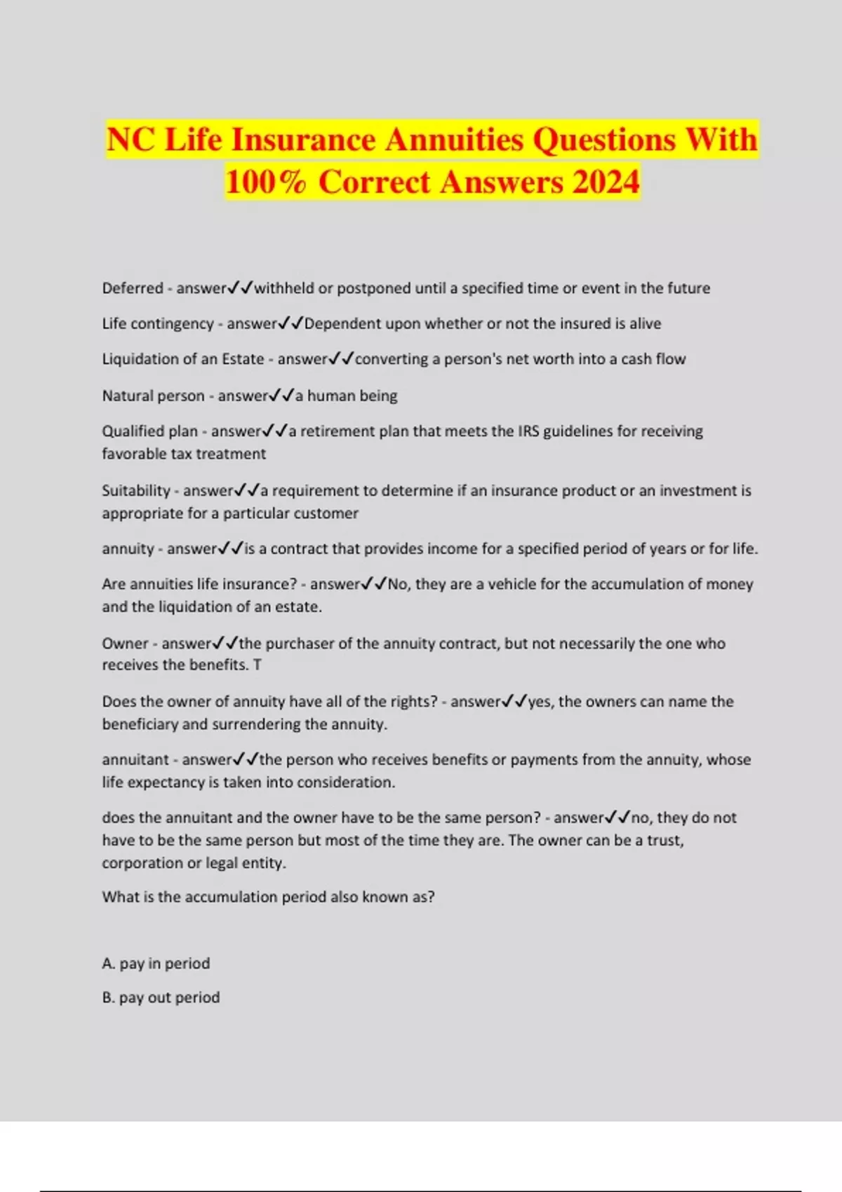 NC Life Insurance Annuities Questions With 100% Correct Answers 2024 Deferred - answerwithheld or postponed until a specified time or event in the future Life contingency - answerDependent upon whether or not the insured is alive Liquidation of an Estate - answerconverting a person's net worth into a cash flow Natural person - answera human being Qualified plan - answera retirement plan that meets the IRS guidelines for receiving favorable tax treatment Suitability - answera requirement to determine if an insurance product or an investment is appropriate for a particular customer annuity - answeris a contract that provides income for a specified period of years or for life. Are annuities life insurance? - answerNo, they are a vehicle for the accumulation of money and the liquidation of an estate. Owner - answerthe purchaser of the annuity contract, but not necessarily the one who receives the benefits. T Does the owner of annuity have all of the rights? - answeryes, the owners can name the beneficiary and surrendering the annuity. annuitant - answerthe person who receives benefits or payments from the annuity, whose life expectancy is taken into consideration. does the annuitant and the owner have to be the same person? - answerno, they do not have to be the same person but most of the time they are. The owner can be a trust, corporation or legal entity. What is the accumulation period also kn