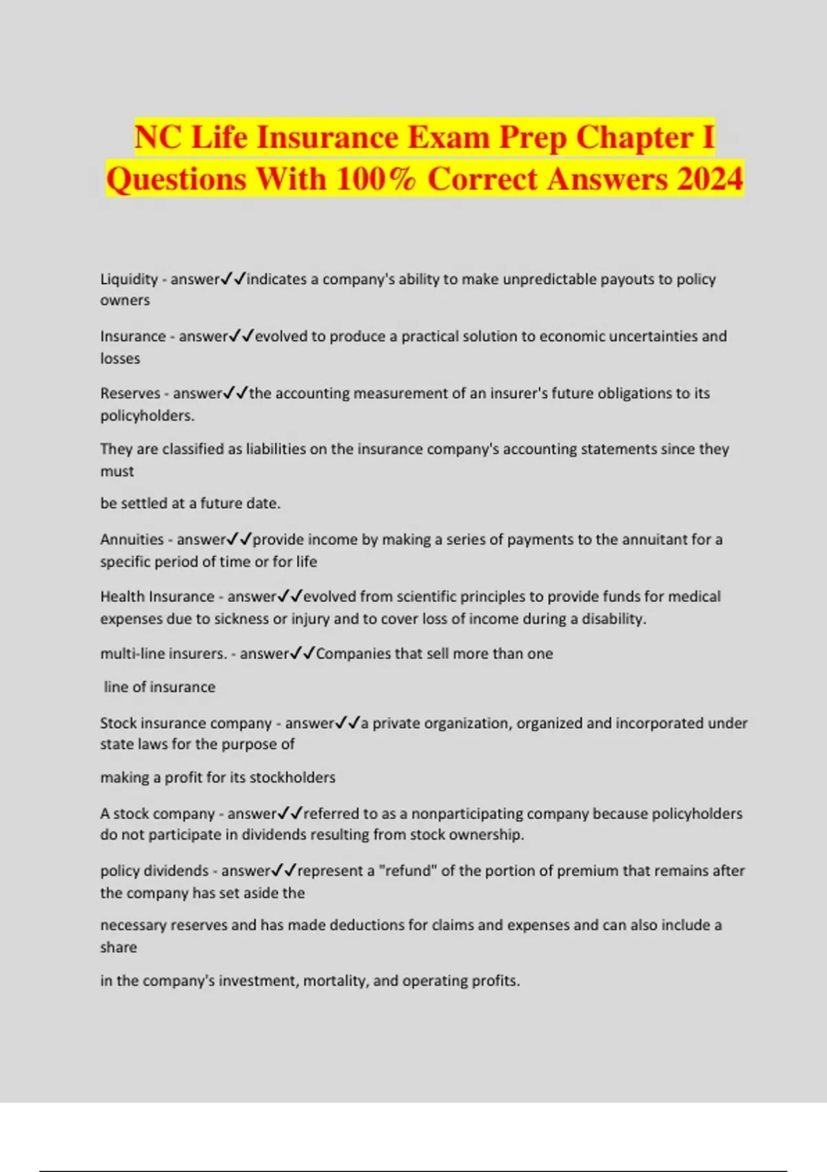 NC Life Insurance Exam Prep Chapter I Questions With 100% Correct Answers 2024 Liquidity - answerindicates a company's ability to make unpredictable payouts to policy owners Insurance - answerevolved to produce a practical solution to economic uncertainties and losses Reserves - answerthe accounting measurement of an insurer's future obligations to its policyholders. They are classified as liabilities on the insurance company's accounting statements since they must be settled at a future date. Annuities - answerprovide income by making a series of payments to the annuitant for a specific period of time or for life Health Insurance - answerevolved from scientific principles to provide funds for medical expenses due to sickness or injury and to cover loss of income during a disability. multi-line insurers. - answerCompanies that sell more than one line of insurance Stock insurance company - answera private organization, organized and incorporated under state laws for the purpose of making a profit for its stockholders A stock company - answerreferred to as a nonparticipating company because policyholders do not participate in dividends resulting from stock ownership. policy dividends - answerrepresent a "refund" of the portion of premium that remains after the company has set aside the necessary reserves and has made deductions for claims and expenses and can also include a share in the company's investment, mortality, and operating profits.