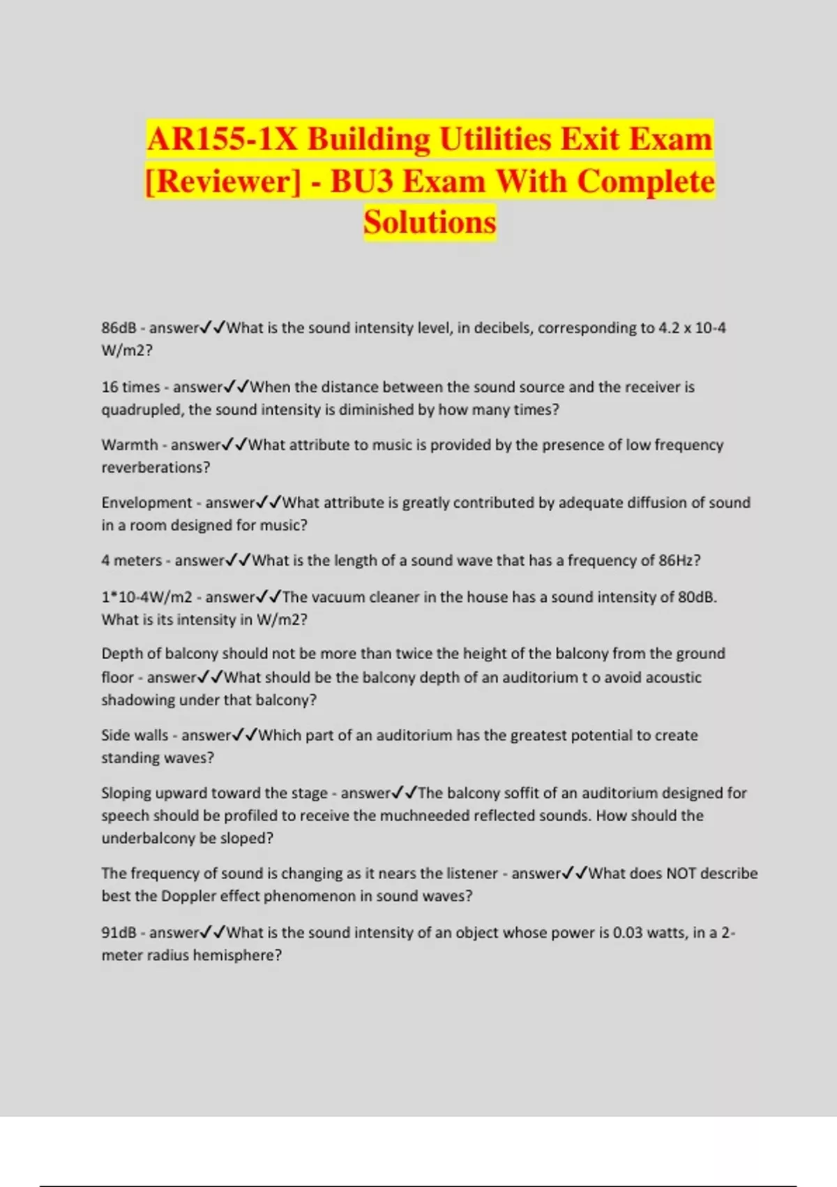 AR155-1X Building Utilities Exit Exam [Reviewer] - BU3 Exam With Complete Solutions 86dB - answerWhat is the sound intensity level, in decibels, corresponding to 4.2 x 10-4 W/m2? 16 times - answerWhen the distance between the sound source and the receiver is quadrupled, the sound intensity is diminished by how many times? Warmth - answerWhat attribute to music is provided by the presence of low frequency reverberations? Envelopment - answerWhat attribute is greatly contributed by adequate diffusion of sound in a room designed for music? 4 meters - answerWhat is the length of a sound wave that has a frequency of 86Hz? 1*10-4W/m2 - answerThe vacuum cleaner in the house has a sound intensity of 80dB. What is its intensity in W/m2? Depth of balcony should not be more than twice the height of the balcony from the ground floor - answerWhat should be the balcony depth of an auditorium t o avoid acoustic shadowing under that balcony? Side walls - answerWhich part of an auditorium has the greatest potential to create standing waves? Sloping upward toward the stage - answerThe balcony soffit of an auditorium designed for speech should be profiled to receive the muchneeded reflected sounds. How should the underbalcony be sloped? The frequency of sound is changing as it nears the listener - answerWhat does NOT describe best the Doppler effect phenomenon in sound waves? 91dB - answerWhat is the sound intensity of an object whose power is 0.03 watts, in a 2- meter radius hemisphere?