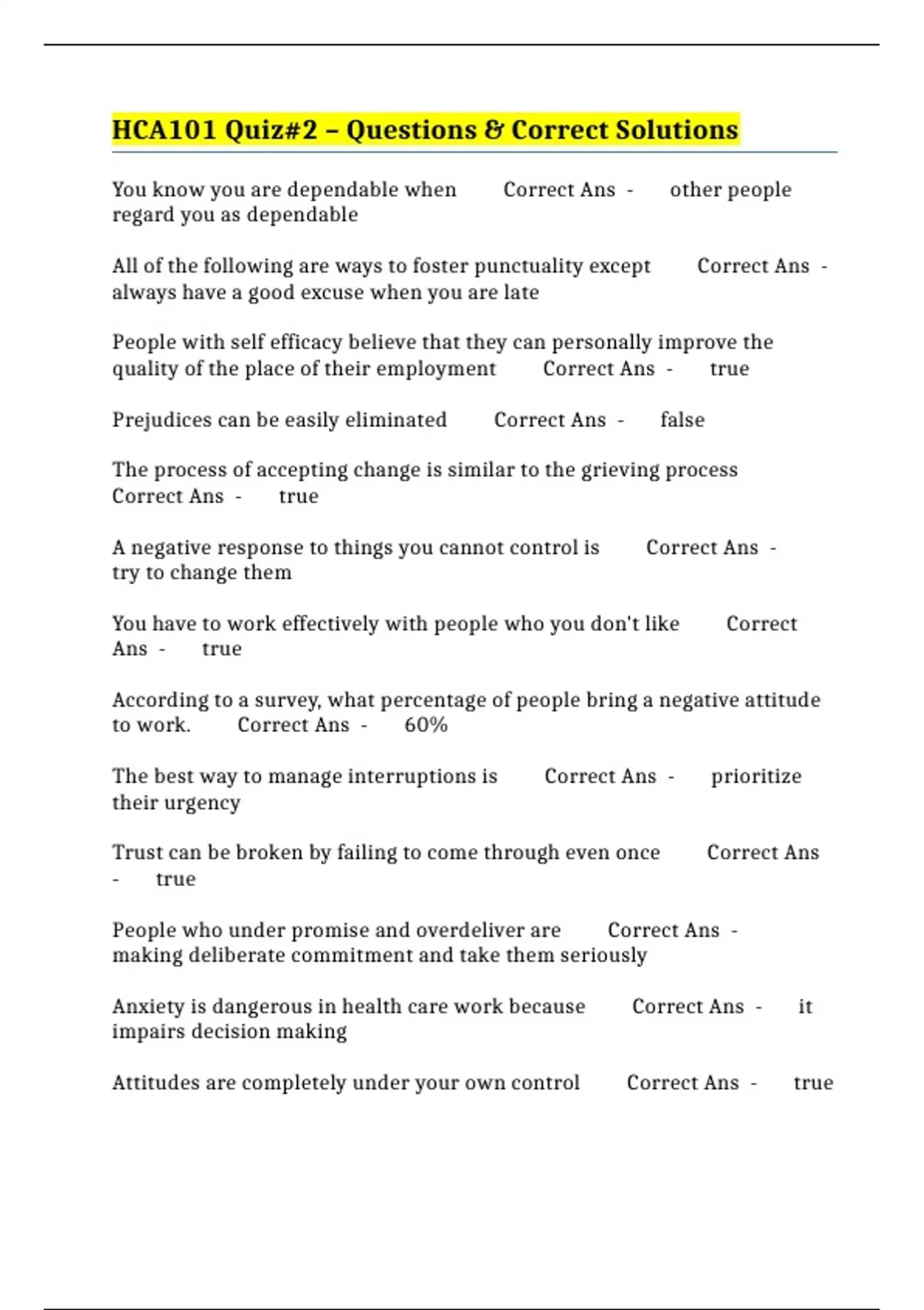 HCA101 Quiz#2 – Questions & Correct Solutions