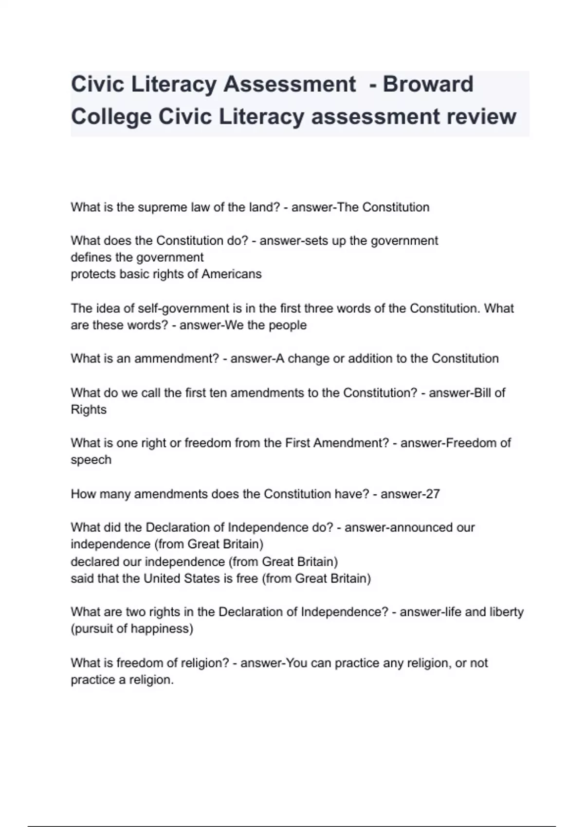 Civic Literacy Assessment - Broward College Civic Literacy assessment review Q&A