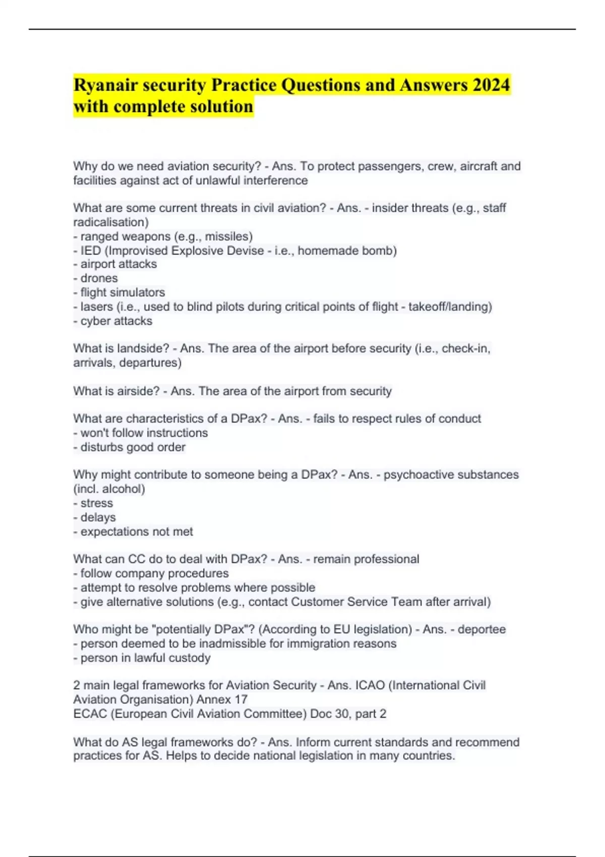 Ryanair security Practice Questions and Answers 2024 with complete solution