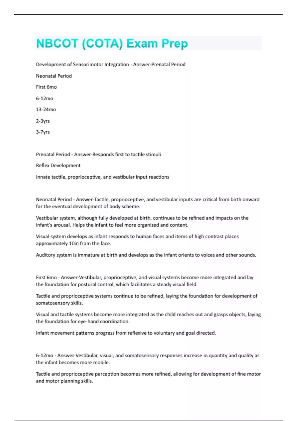 Development of Sensorimotor Integration - Answer-Prenatal Period Neonatal Period First 6mo 6-12mo 13-24mo 2-3yrs 3-7yrs Prenatal Period - Answer-Responds first to tactile stimuli Reflex Development Innate tactile, proprioceptive, and vestibular input reactions Neonatal Period - Answer-Tactile, proprioceptive, and vestibular inputs are critical from birth onward for the eventual development of body scheme. Vestibular system, although fully developed at birth, continues to be refined and impacts on the infant's arousal. Helps the infant to feel more organized and content. Visual system develops as infant responds to human faces and items of high contrast places approximately 10in from the face. Auditory system is immature at birth and develops as the infant orients to voices and other sounds. First 6mo - Answer-Vestibular, proprioceptive, and visual systems become more integrated and lay the foundation for postural control, which facilitates a steady visual field. Tactile and proprioceptive systems continue to be refined, laying the foundation for development of somatosensory skills. Visual and tactile systems become more integrated as the child reaches out and grasps objects, laying the foundation for eye-hand coordination. Infant movement patterns progress from reflexive to voluntary and goal directed. 6-12mo - Answer-Vestibular, visual, and somatosensory responses increase in quantity and quality as the infant becomes more mobile. Tactile and proprioceptive perception becomes more refined, allowing for development of fine motor and motor planning skills.Tactile and proprioceptive responses also lead to midline skills and eventual crossing of midline. Auditory, tactle, and proprioceptive perception is heightened allowing for development of sounds for the purpose of communication. Tactile, proprioceptive, gustatory, and olfactory perception are integrated, allowing for primitive selffeeding. 13-24mo - Answer-Tactile perception becomes more precise allowing for discrimination and localization to further refinement of fine motor skills. Further integration of all systems promotes the complexity of motor planning as the toddler's repertoire of movement patterns expands. Symbolic gesturing and vocalization promotes ideation, indicating the toddler's ability to conceptualize. Motor planning abilities contribute to self-concept as the toddler begins to master the environment. 2-3yrs - Answer-This is a period of refinement as the vestibular, proprioceptive, and visual systems further develop, leading to improved balance and postural control. Further development of tactile discrimination and localization lead to improved fine motor skills. Motor planning and praxis ideation also progresses during this period for more skillful occupational performance. 3-7yrs - Answer-Child is driven to challenge sensorimotor competencies through roughhouse play, playground activities, games, sports, music, dancing , arts and crafts, household chores, and school tasks. These occupations provide opportunities to promote psychosocial development and selfesteem. Crossing Midline - Answer-As the child becomes more mobile, movement against gravity and weightshift increase, leading to eventual crossing of the midline, often in attempt to reach for a toy, while weightbearing on the opposing upper extremity for balance. Begins at 9-12mo. Laterality - Answer-Hemispheric specialization for specific tasks varies with different individuals Bilateral Integration - Answer-As the child experiments with movement, the nervous system is stimulated, and the resulting sensations help the child to coordinate the two sides of the body. Begins at 9-12mo.Visual-Motor Integration - Answer-Dependent upon the lower level skills of visual attention, visual memory, visual discrimination, kinesthesia, position in space, figure ground, form constancy, and spatial relations.