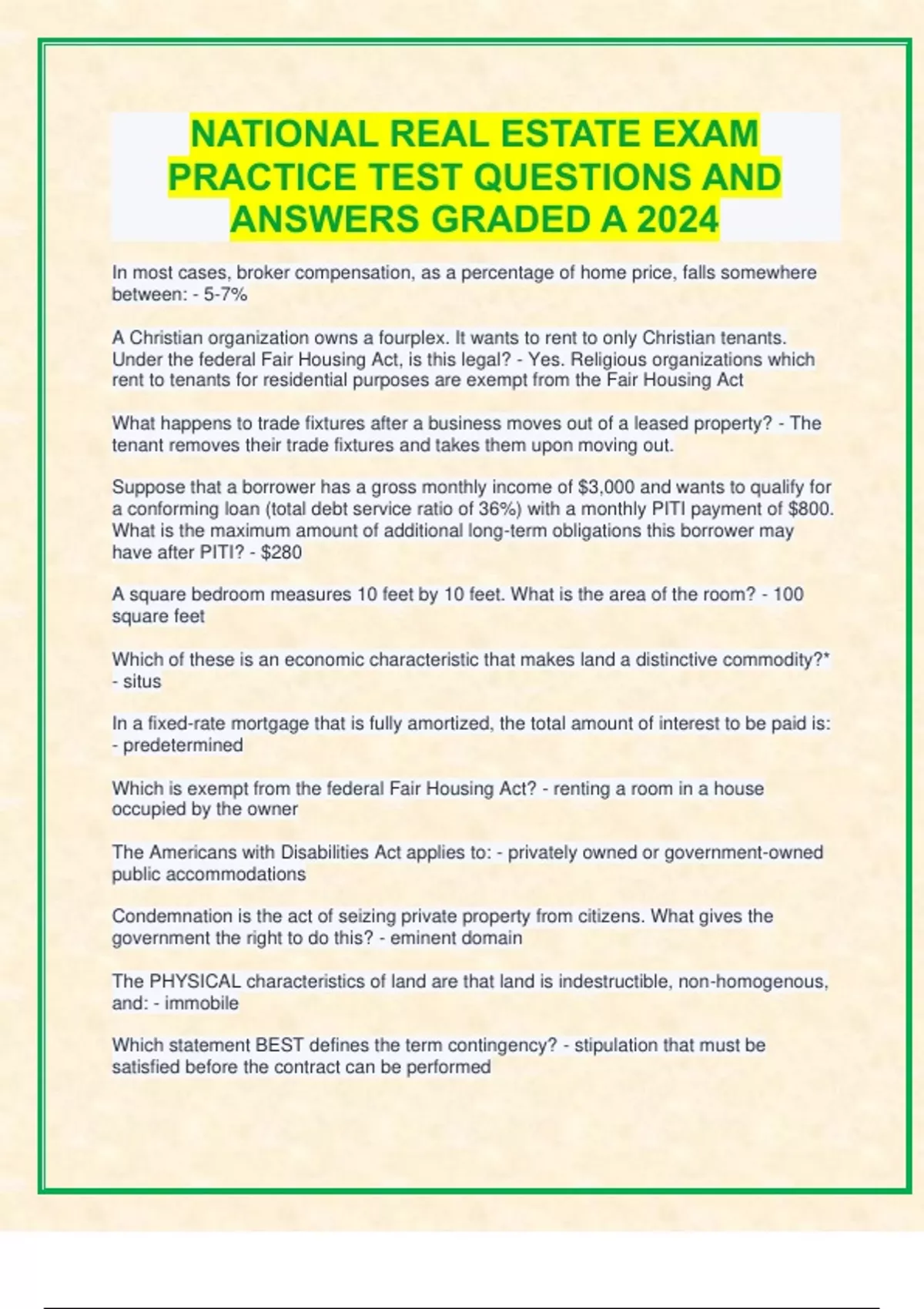 NATIONAL REAL ESTATE EXAM PRACTICE TEST QUESTIONS AND ANSWERS GRADED A 2024