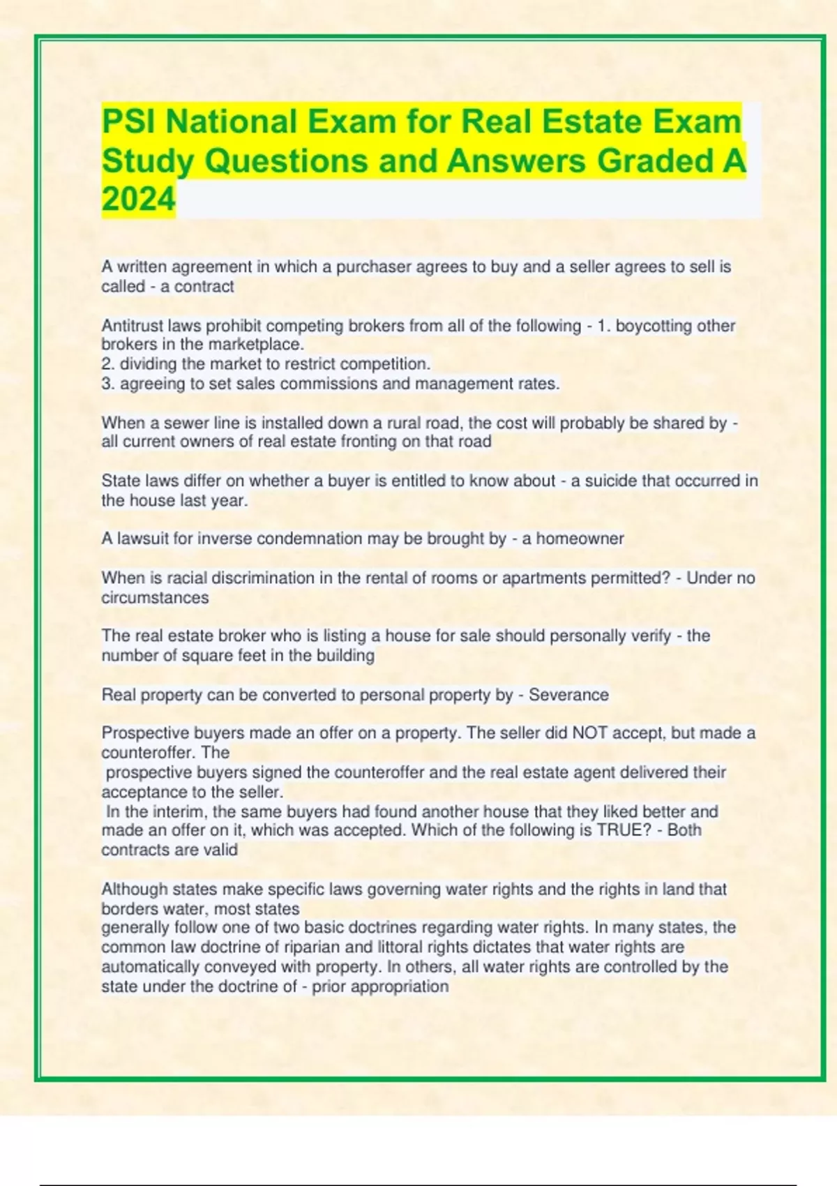 PSI National Exam for Real Estate Exam Study Questions and Answers Graded A 2024