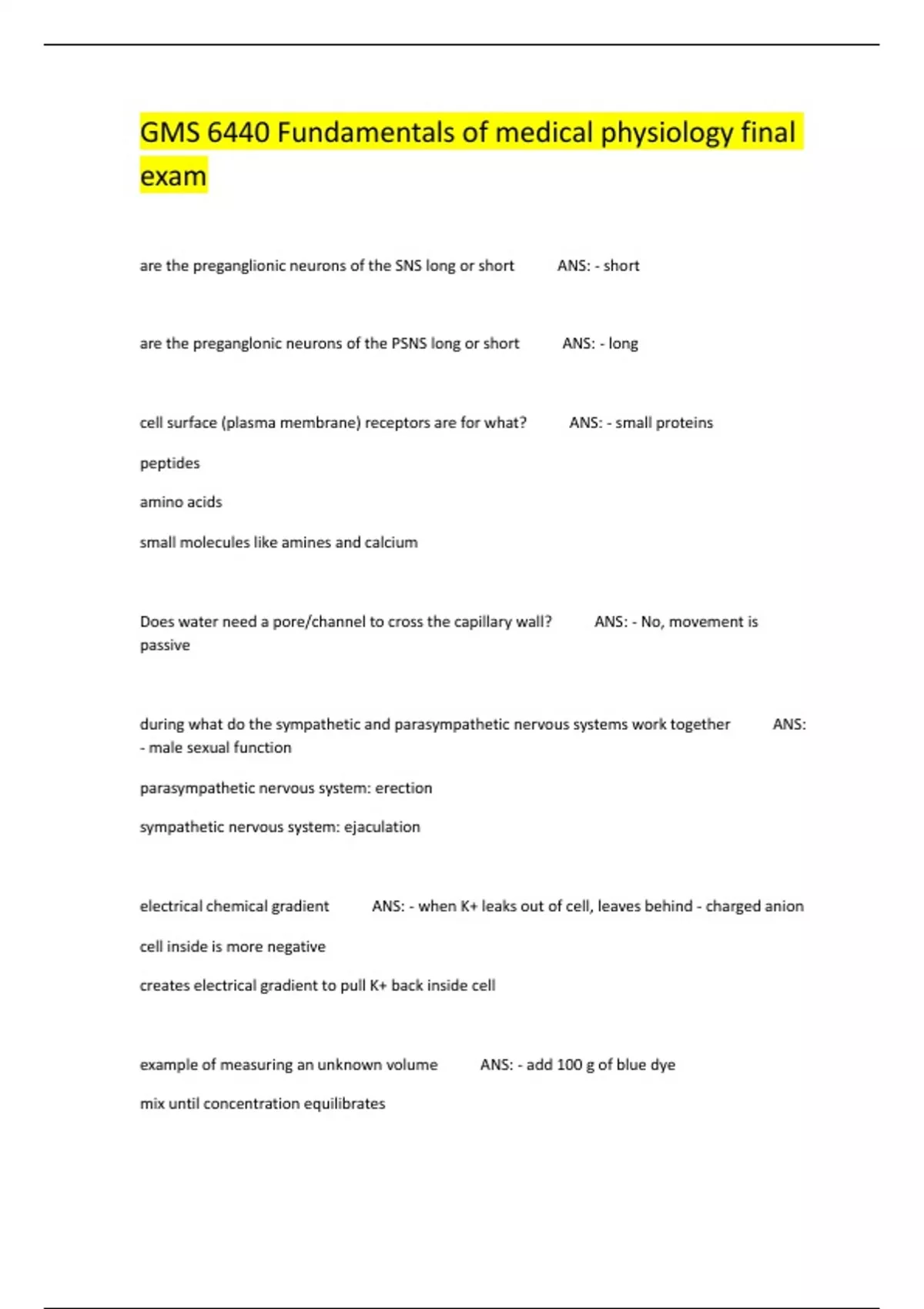 GMS 6440 Fundamentals Of Medical Physiology Final Exam Questions With Correct Answers, 100% Guaranteed Pass ||Complete A+ Guide Does water need a pore/channel to cross the capillary wall? ANS: - No, movement is passive during what do the sympathetic and parasympathetic nervous systems work together ANS: - male sexual function parasympathetic nervous system: erection sympathetic nervous system: ejaculation electrical chemical gradient ANS: - when K+ leaks out of cell, leaves behind - charged anion cell inside is more negative creates electrical gradient to pull K+ back inside cell example of measuring an unknown volume ANS: - add 100 g of blue dye mix until concentration equilibrates concentration at equilibrium