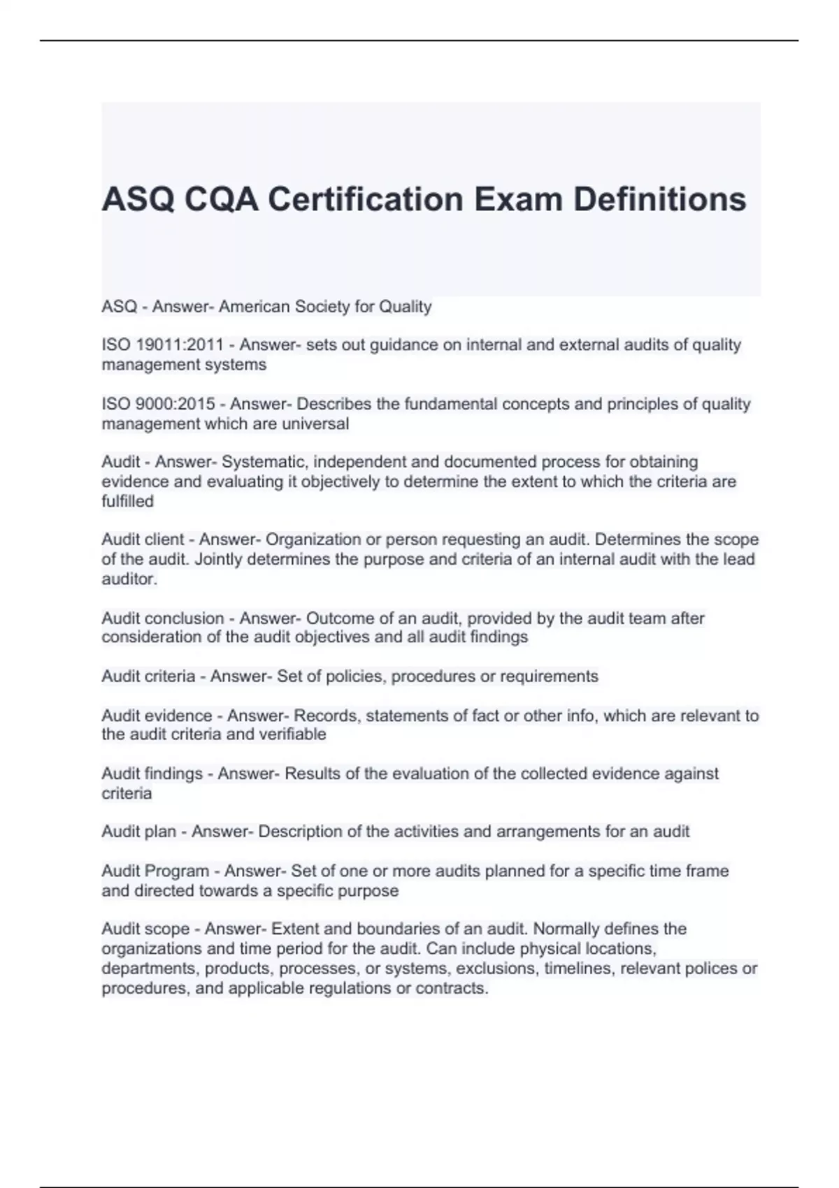 ASQ CQA Certification Exam Definitions Questions and Answers