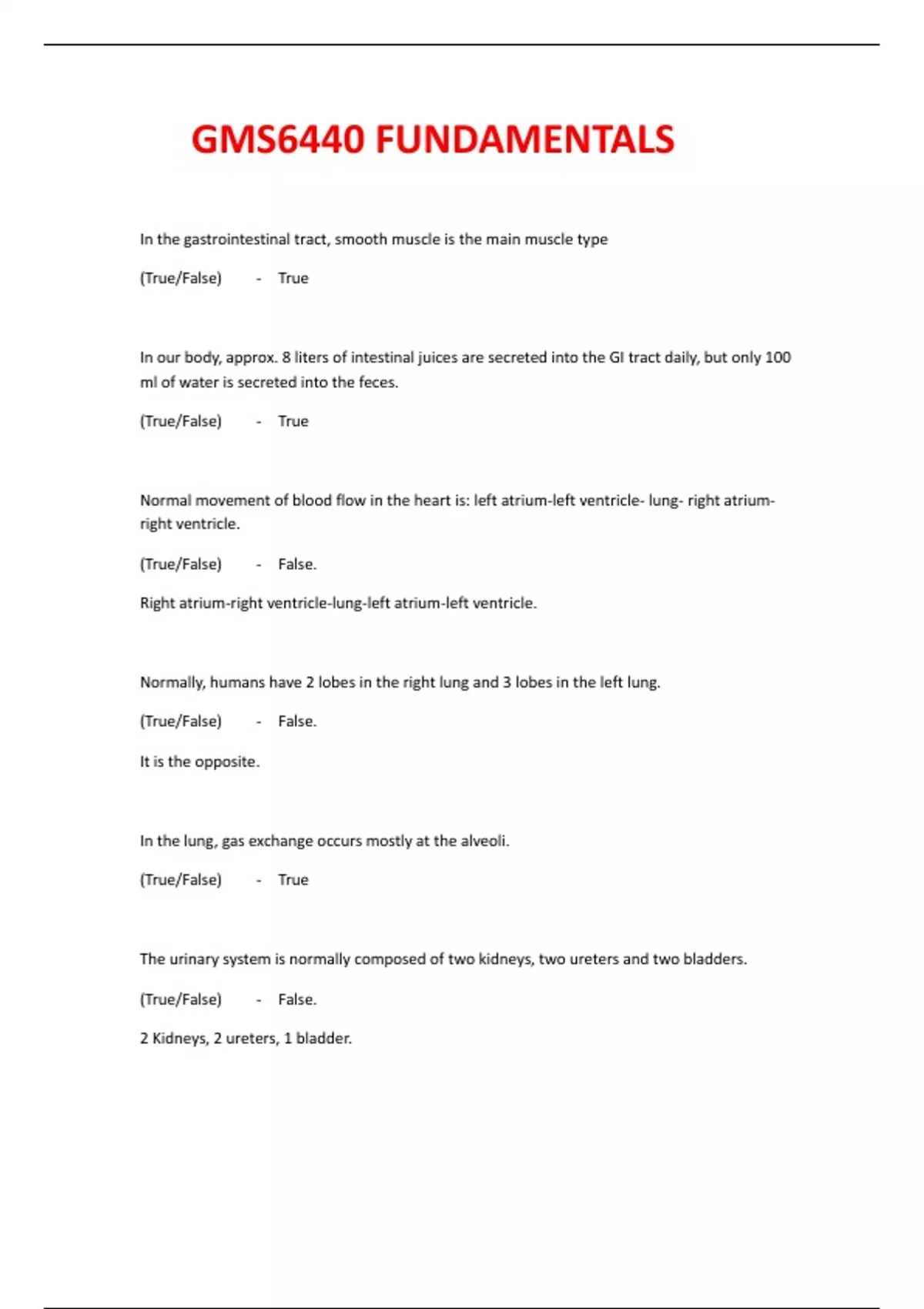 Filtered wastes from the glomerulus will move in the following order: Bowman's capsule-proximal tubule-distal tubule-loop of henle- collecting duct. (True/False) - False. Bowman's capsule- proximal tubule- loop of henle- distal tubule- collecting duct. Specificity of hormone action in the target cells is determined by receptors. (True/False) - True. The area of nerve axon not wrapped by myelin sheath is called the nodes of Rnavier where action potential is insulated. (True/False) - False. Myelin sheath insulates action potential. Action potential propagates faster by skipping myelinated axon, and jumping from nodes of Ranvier to another node. What chemical component of the plasma membrane prevents ions from readily and freely moving across the membrane? - Lipids (phospholipids) Where is the concentration of [K+] greater? Cytoplasm or extracellular fluid? - Cytoplasm Across a cell's plasma membrane, movement of water is (passive through a channel or an active event)? - Passive through a channel Where is the concentration of [Na+] greater? Cytoplasm or Extracellular fluid? - Extracellular fluid Regarding secondary active transport of glucose, the movement of glucose is from a compartment of high concentration to low concentration. (True/False) - False, it moves into the cell with sodium from low to high c
