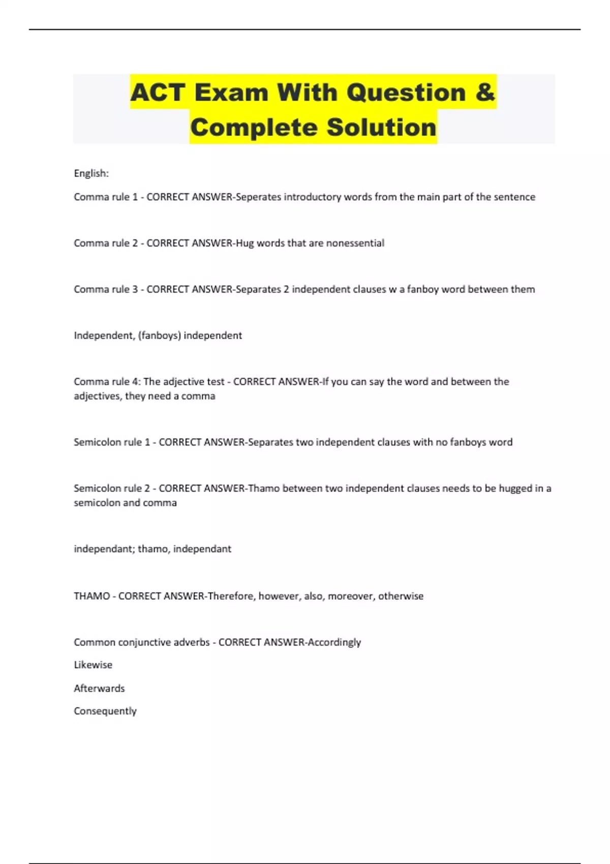 ACT Exam With Question & Complete Solution English: Comma rule 1 - CORRECT ANSWER-Seperates introductory words from the main part of the sentence Comma rule 2 - CORRECT ANSWER-Hug words that are nonessential Comma rule 3 - CORRECT ANSWER-Separates 2 independent clauses w a fanboy word between them Independent, (fanboys) independent Comma rule 4: The adjective test - CORRECT ANSWER-If you can say the word and between the adjectives, they need a comma