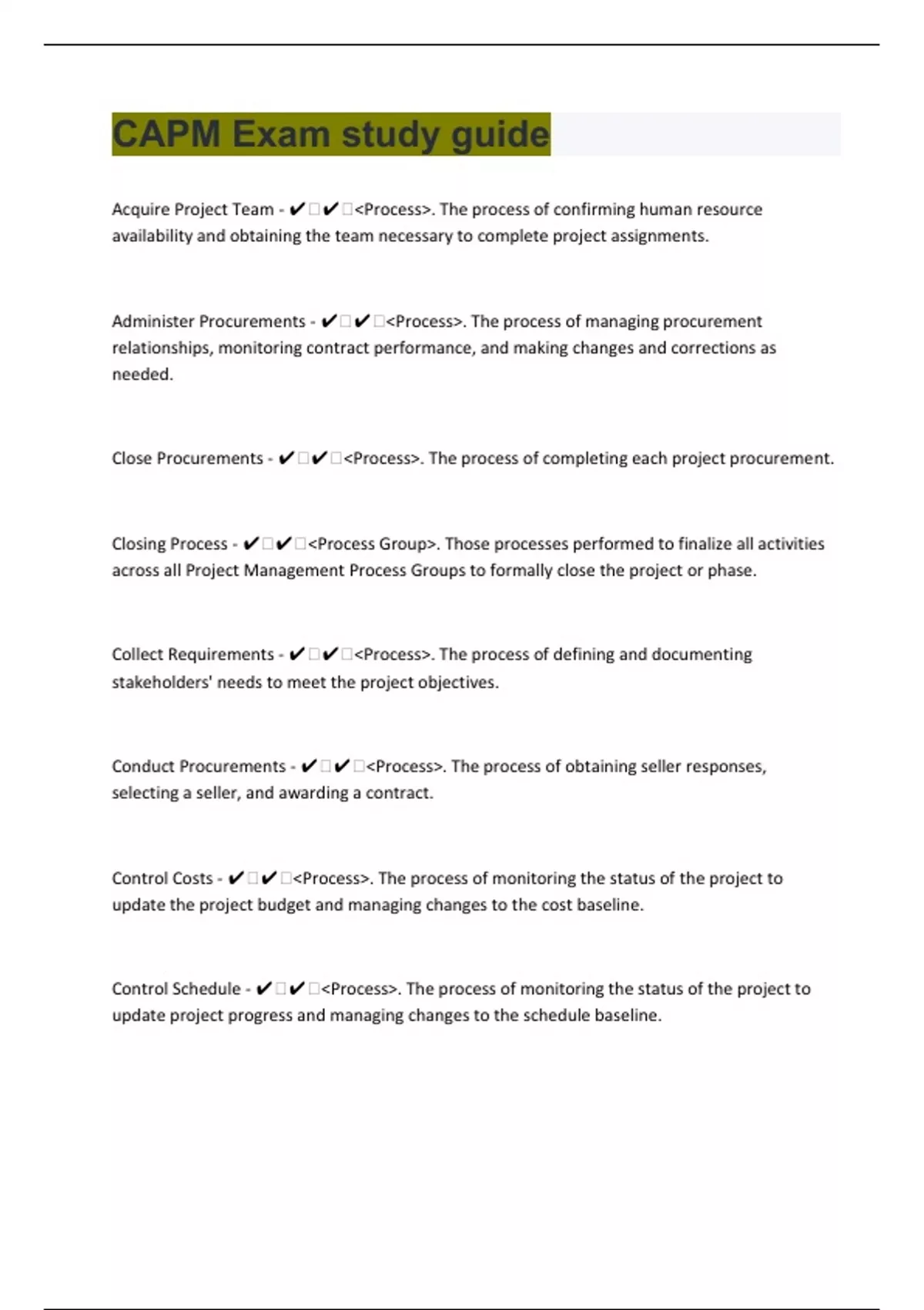 Acquire Project Team - ️️<Process>. The process of confirming human resource availability and obtaining the team necessary to complete project assignments. Administer Procurements - ️️<Process>. The process of managing procurement relationships, monitoring contract performance, and making changes and corrections as needed. Close Procurements - ️️<Process>. The process of completing each project procurement. Closing Process - ️️<Process Group>. Those processes performed to finalize all activities across all Project Management Process Groups to formally close the project or phase. Collect Requirements - ️️<Process>. The process of defining and documenting stakeholders' needs to meet the project objectives. Conduct Procurements - ️️<Process>. The process of obtaining seller responses, selecting a seller, and awarding a contract. Control Costs - ️️<Process>. The process of monitoring the status of the project to update the project budget and managing changes to the cost baseline. Control Schedule - ️️<Process>. The process of monitoring the status of the project to update project progress and managing changes to the schedule baseline.