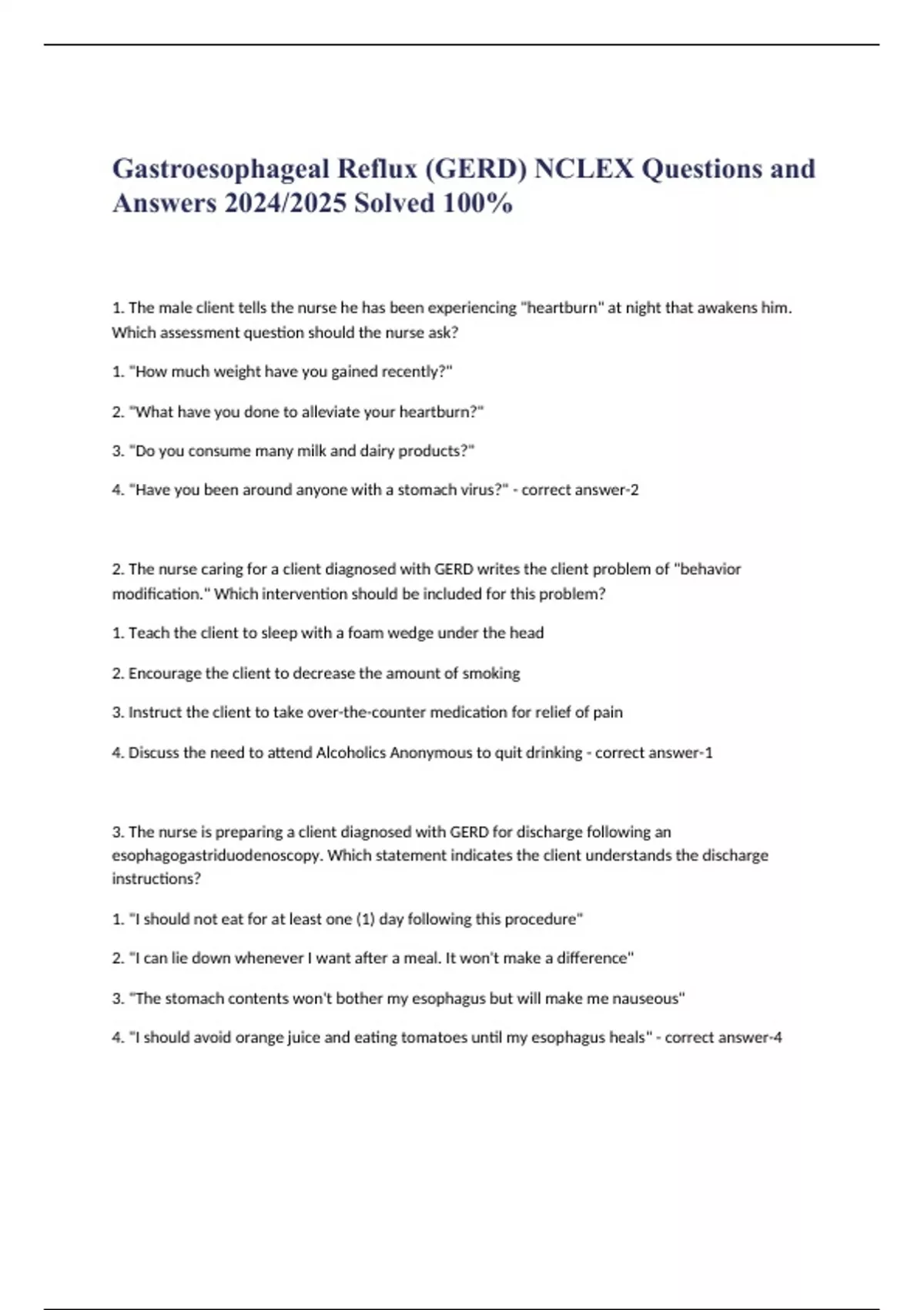 Gastroesophageal Reflux (GERD) NCLEX Questions and Answers 2024/2025 Solved 100%