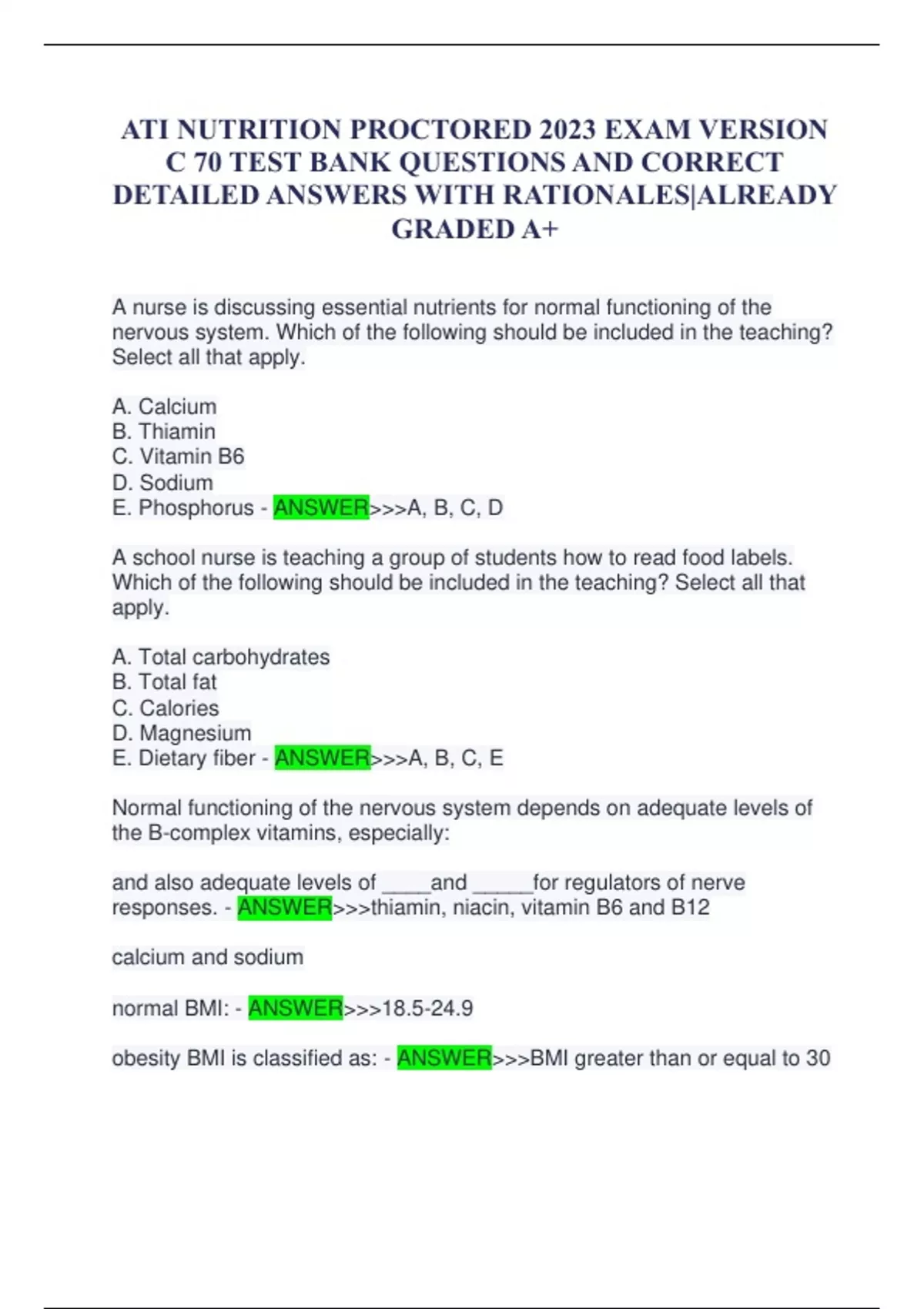 ATI NUTRITION PROCTORED 2023 EXAM VERSION C 70 TEST BANK QUESTIONS AND CORRECT DETAILED ANSWERS WITH RATIONALES|ALREADY GRADED A+
