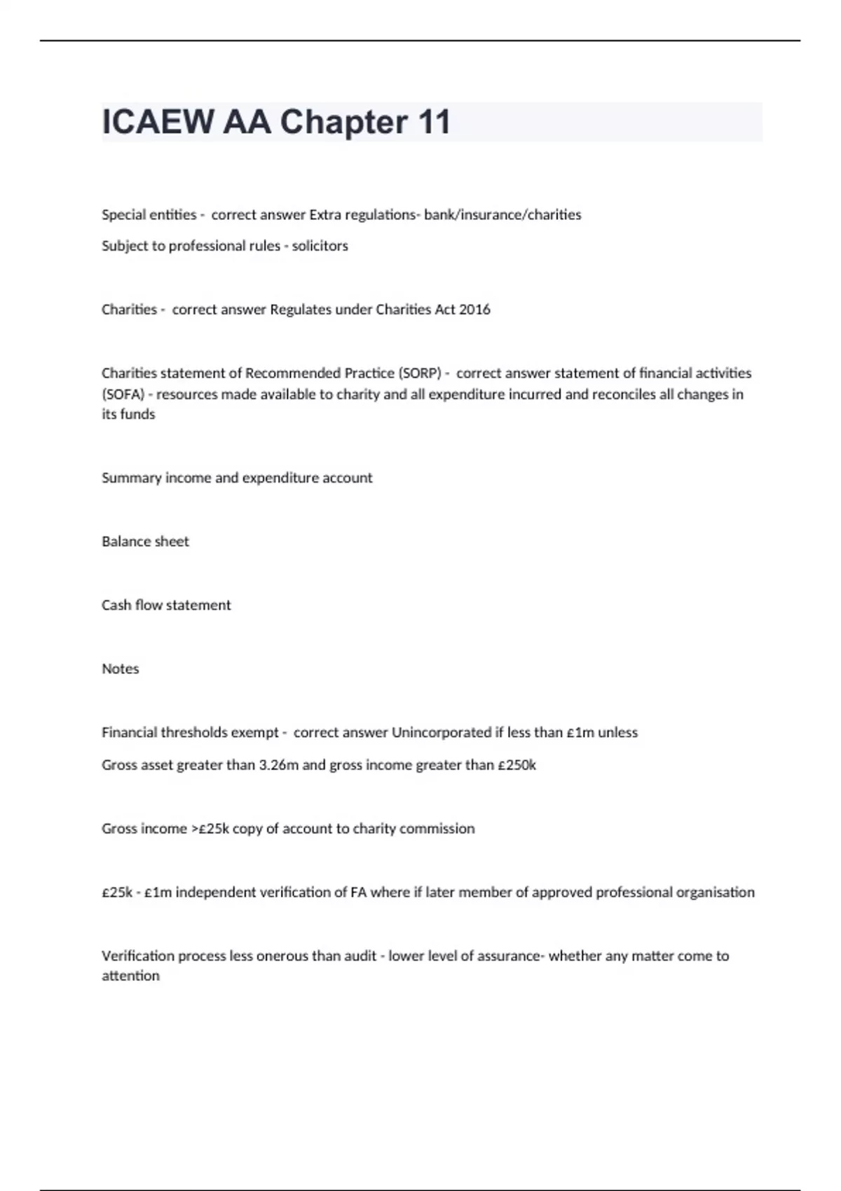 ICAEW AA Chapter 11 Special entities - correct answer Extra regulations- bank/insurance/charities Subject to professional rules - solicitors Charities - correct answer Regulates under Charities Act 2016 Charities statement of Recommended Practice (SORP) - correct answer statement of financial activities (SOFA) - resources made available to charity and all expenditure incurred and reconciles all changes in its funds Summary income and expenditure account Balance sheet Cash flow statement Notes Financial thresholds exempt - correct answer Unincorporated if less than £1m unless Gross asset greater than 3.26m and gross income greater than £250k Gross income >£25k copy of account to charity commission £25k - £1m independent verification of FA where if later member of approved professional organisation Verification process less onerous than audit - lower level of assurance- whether any matter come to attention
