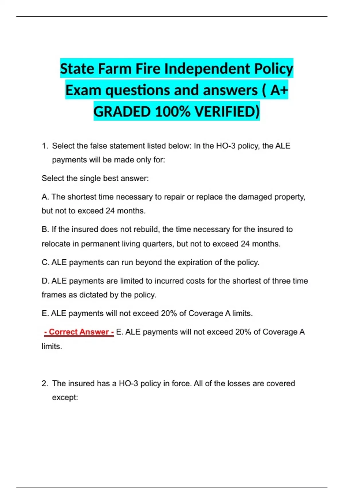 State Farm Fire Independent Policy Exam questions and answers ( A+ GRADED 100% VERIFIED) State Farm Fire Independent Policy Exam questions and answers ( A+ GRADED 100% VERIFIED) State Farm Fire Independent Policy Exam questions and answers ( A+ GRADED 100% VERIFIED)