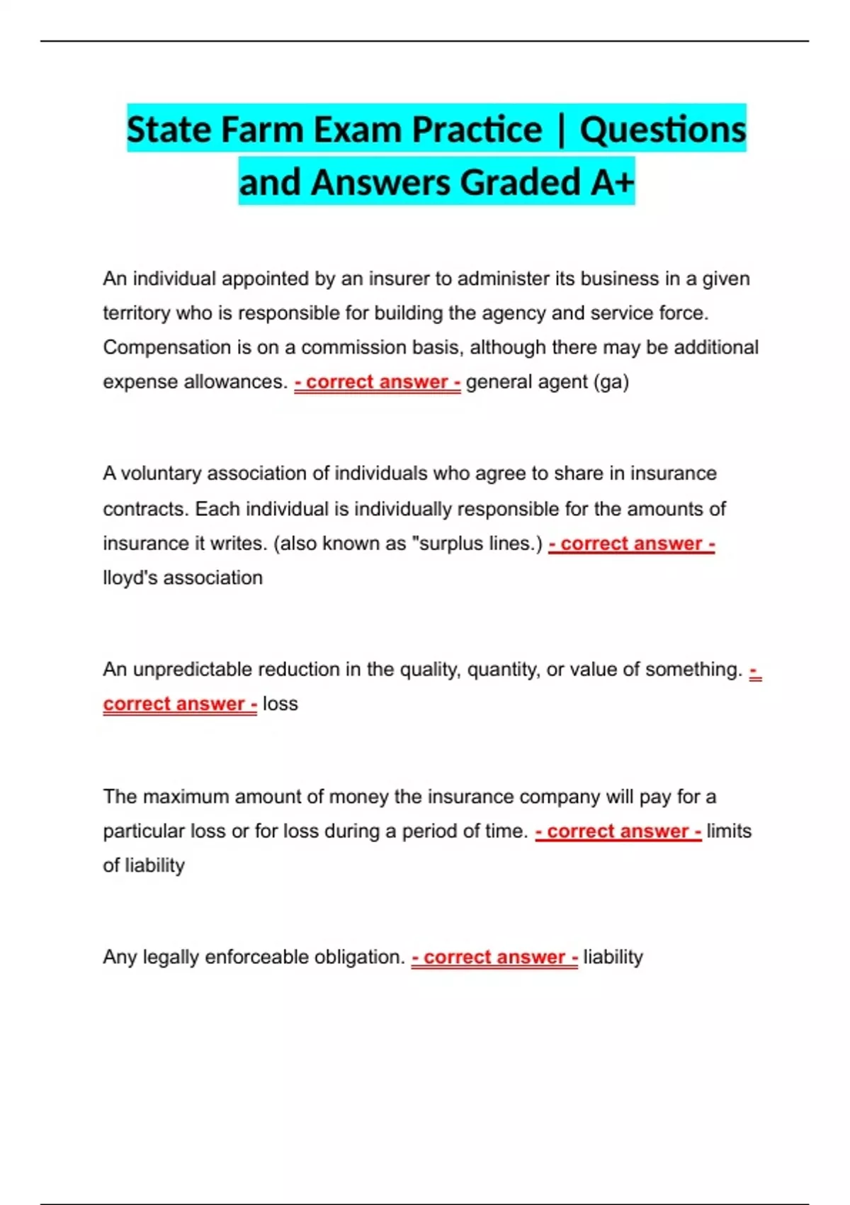 State Farm Exam Practice | Questions and Answers Graded A+ State Farm Exam Practice | Questions and Answers Graded A+ State Farm Exam Practice | Questions and Answers Graded A+