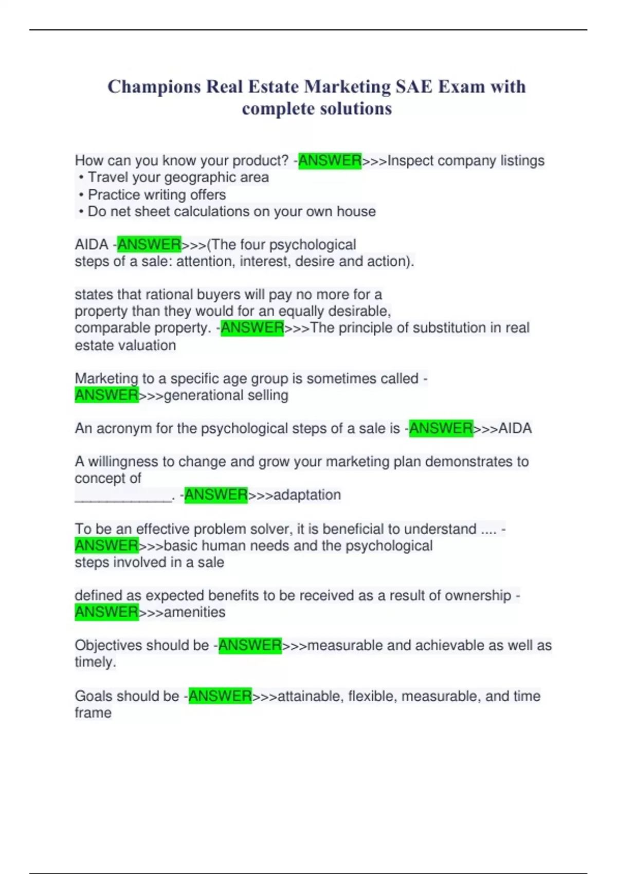 Champions Real Estate Marketing SAE Exam with complete solutions