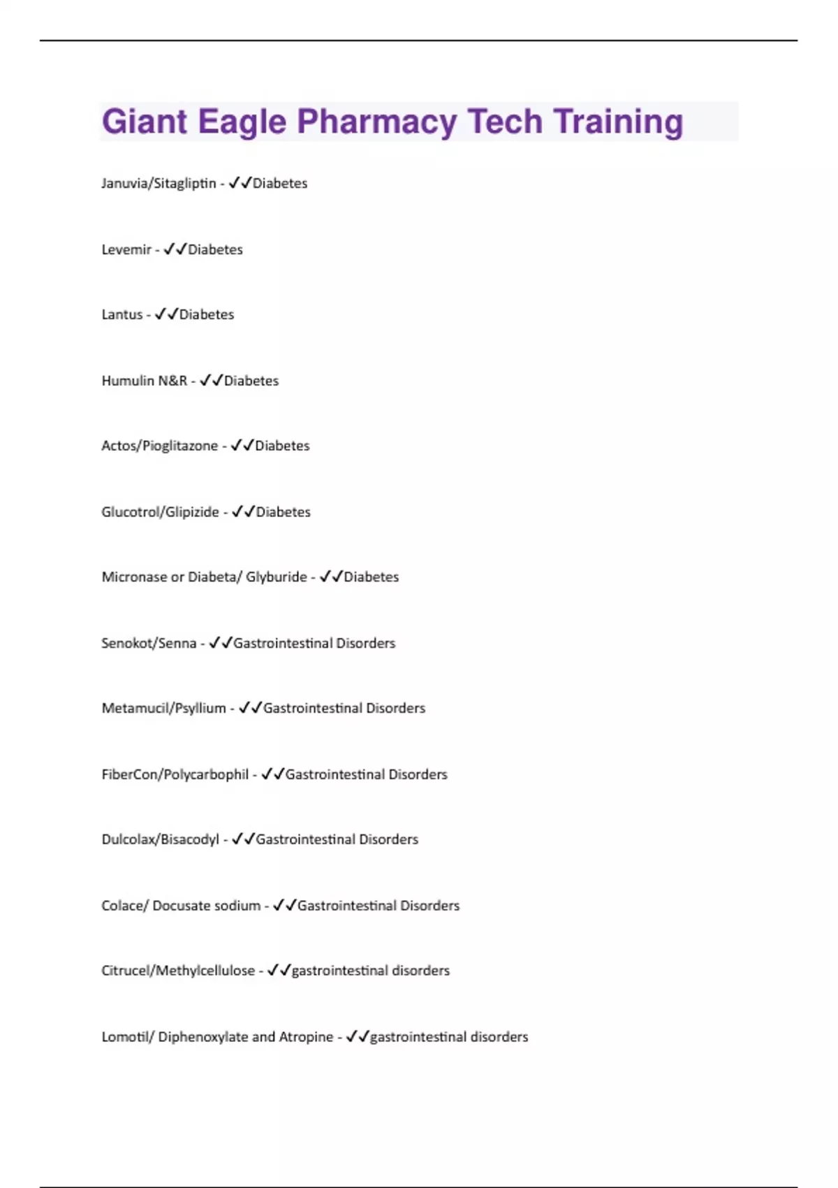 Januvia/Sitagliptin - Diabetes Levemir - Diabetes Lantus - Diabetes Humulin N&R - Diabetes Actos/Pioglitazone - Diabetes Glucotrol/Glipizide - Diabetes Micronase or Diabeta/ Glyburide - Diabetes Senokot/Senna - Gastrointestinal Disorders Metamucil/Psyllium - Gastrointestinal Disorders FiberCon/Polycarbophil - Gastrointestinal Disorders Dulcolax/Bisacodyl - Gastrointestinal Disorders Colace/ Docusate sodium - Gastrointestinal Disorders Citrucel/Methylcellulose - gastrointestinal disorders Lomotil/ Diphenoxylate and Atropine - gastrointestinal disordersKaopectate/Attapulgite - gastrointestinal disorders Imodium/Loperamide - gastrointestinal disorders Zantac/Ranitidine - gastrointestinal disorders Prilosec/Omeprazole - gastrointestinal disorders Prevacid/Lansoprazole - gastrointestinal disorders Pepcid/Famotidine - gastrointestinal disorders Nexium/Esomeprazole - gastrointestinal disorders