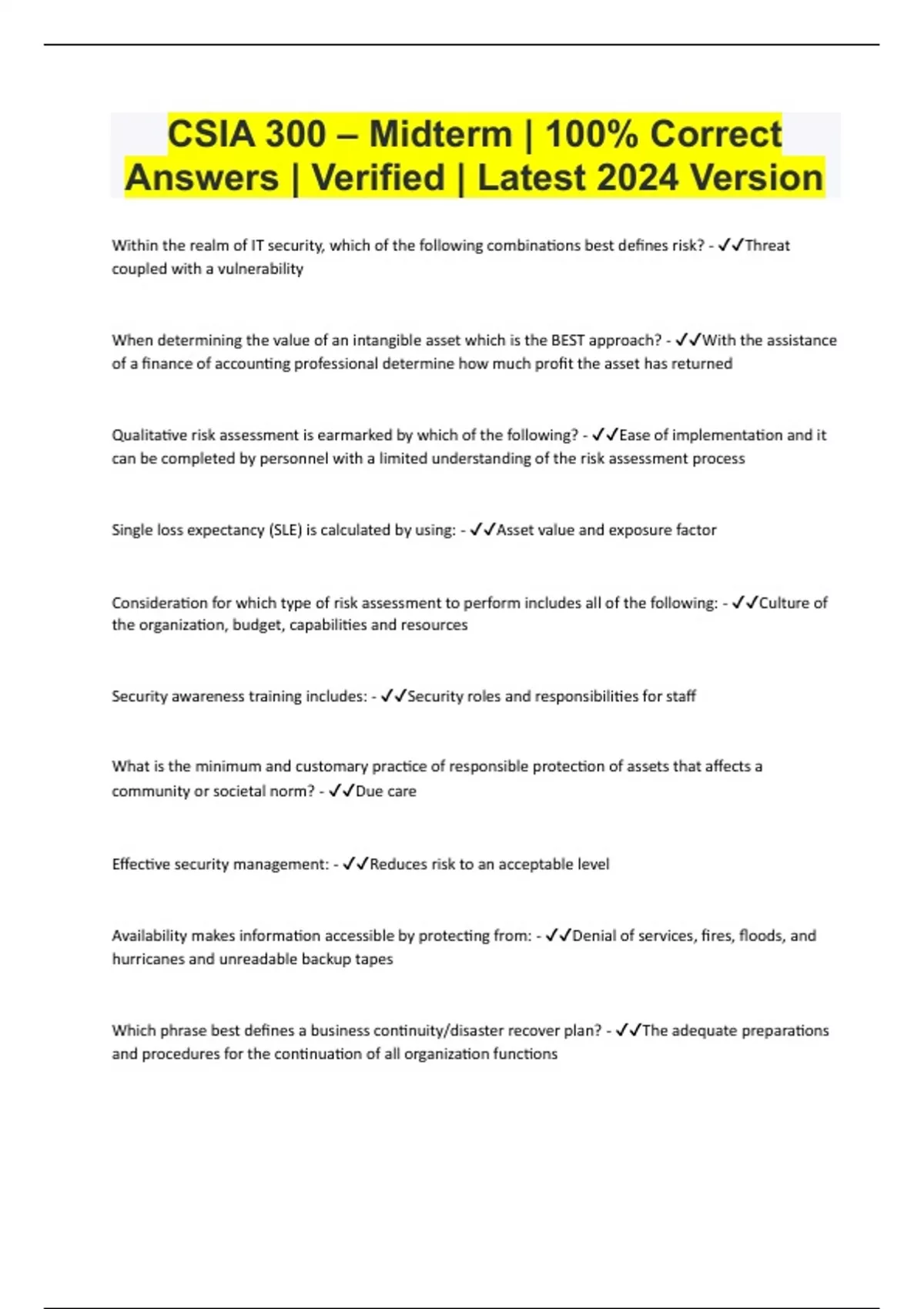 Within the realm of IT security, which of the following combinations best defines risk? - Threat coupled with a vulnerability When determining the value of an intangible asset which is the BEST approach? - With the assistance of a finance of accounting professional determine how much profit the asset has returned Qualitative risk assessment is earmarked by which of the following? - Ease of implementation and it can be completed by personnel with a limited understanding of the risk assessment process Single loss expectancy (SLE) is calculated by using: - Asset value and exposure factor Consideration for which type of risk assessment to perform includes all of the following: - Culture of the organization, budget, capabilities and resources Security awareness training includes: - Security roles and responsibilities for staff