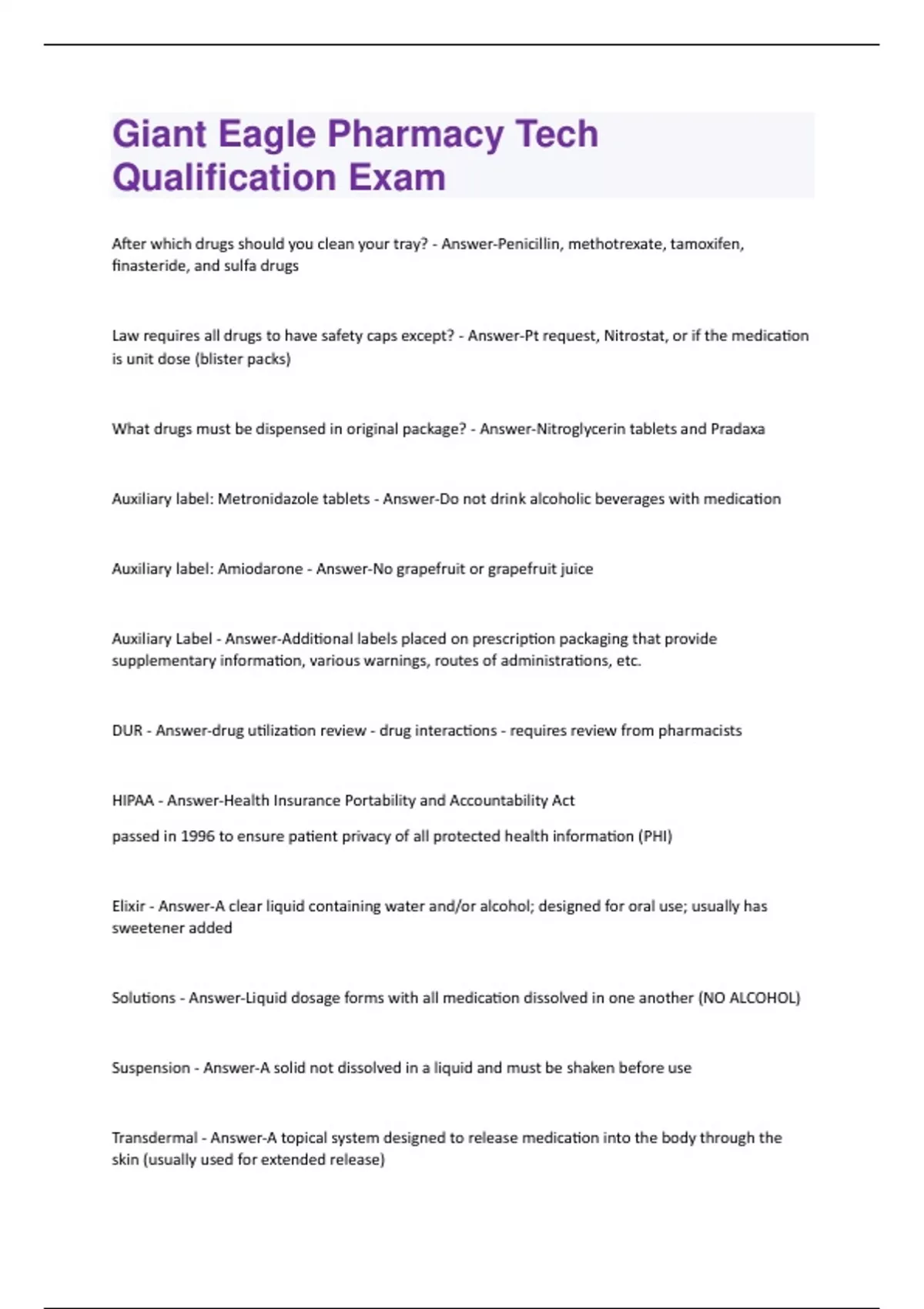 Giant Eagle Pharmacy Tech Qualification Exam (100% correct and graded A+)