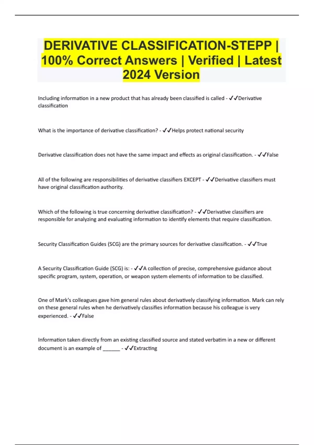 DERIVATIVE CLASSIFICATION-STEPP | 100% Correct Answers | Verified | Latest 2024 Version