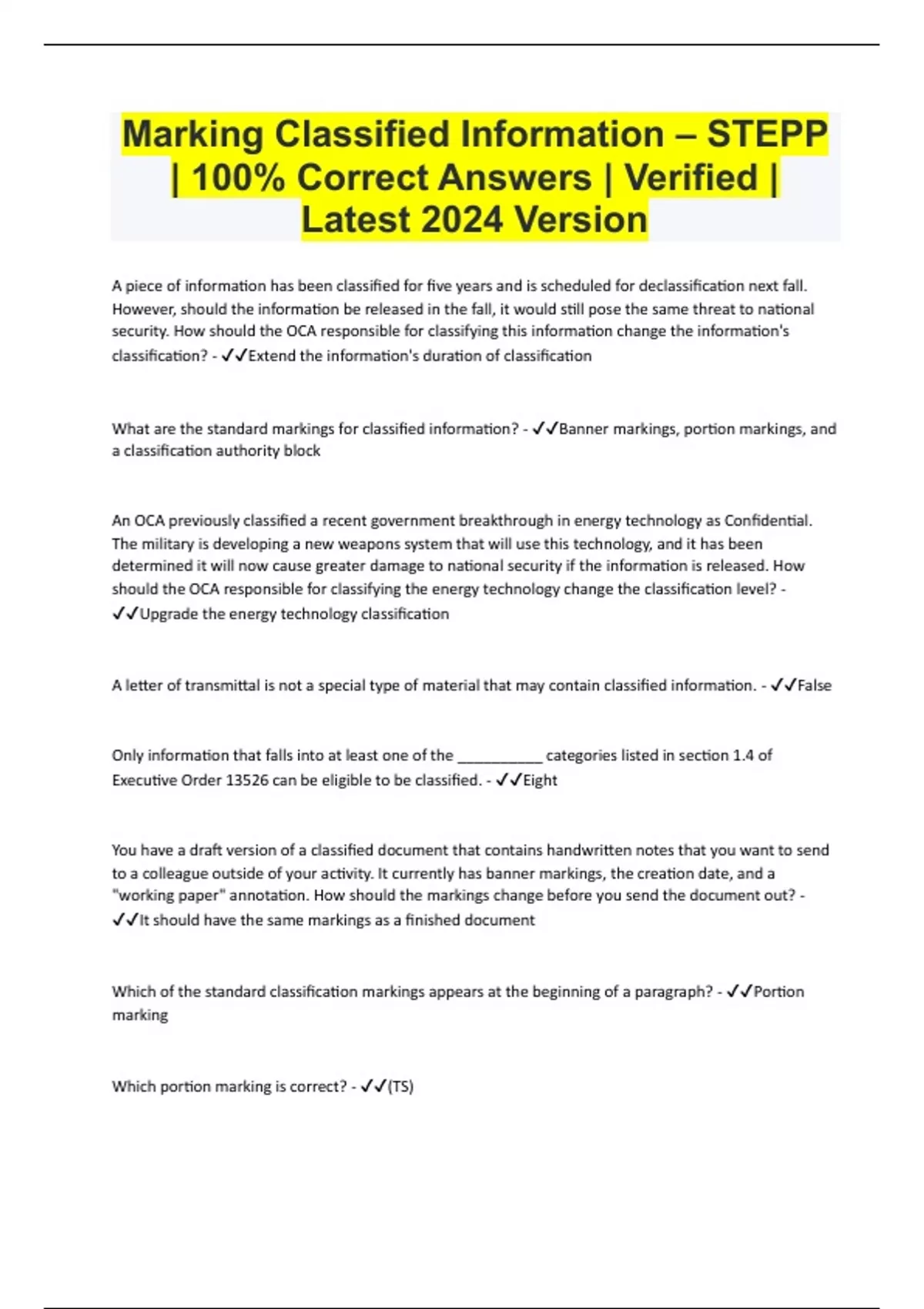 Marking Classified Information – STEPP | 100% Correct Answers | Verified | Latest 2024 Version