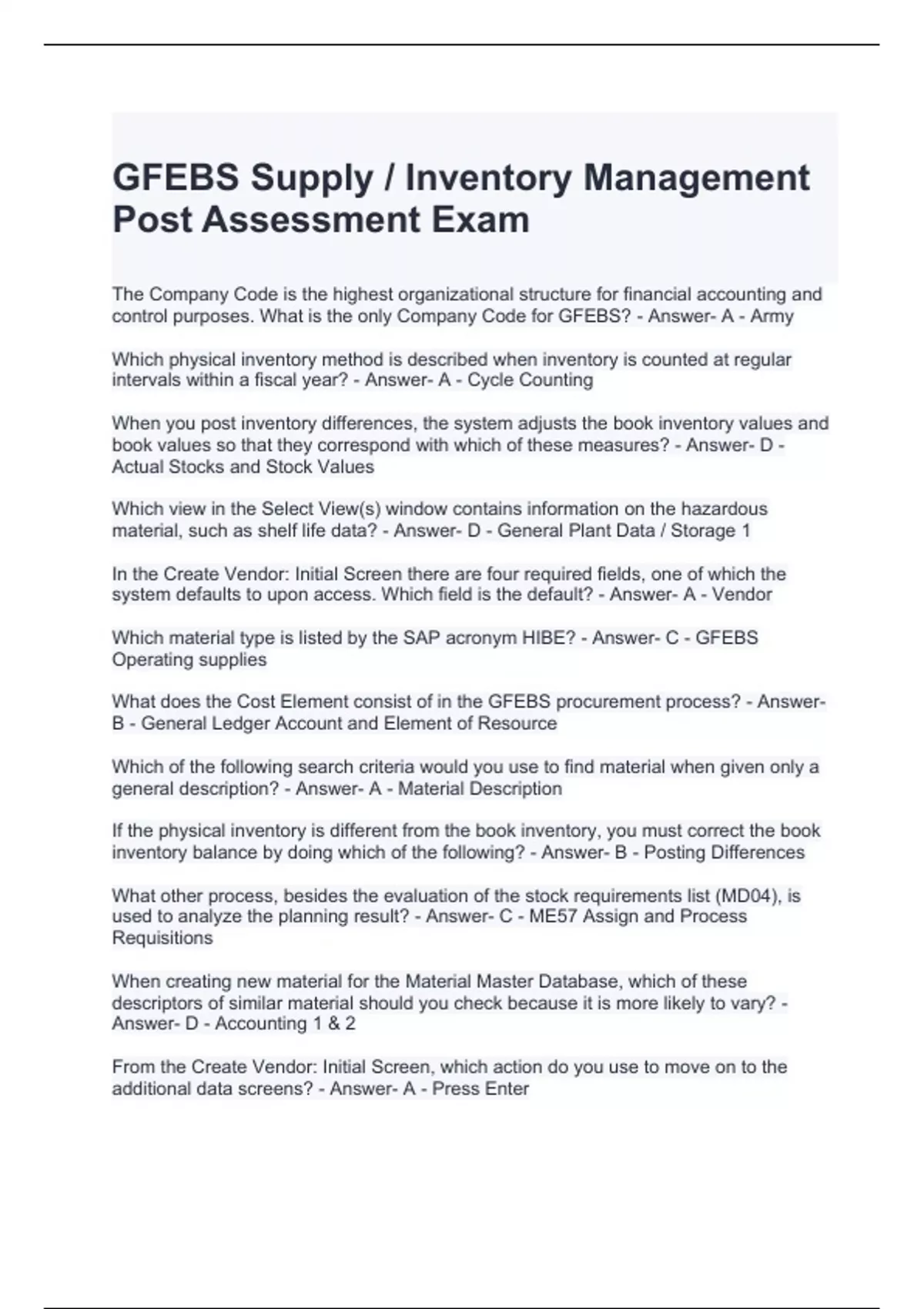 GFEBS Supply - Inventory Management Post Assessment Exam Questions with correct Answers 2024