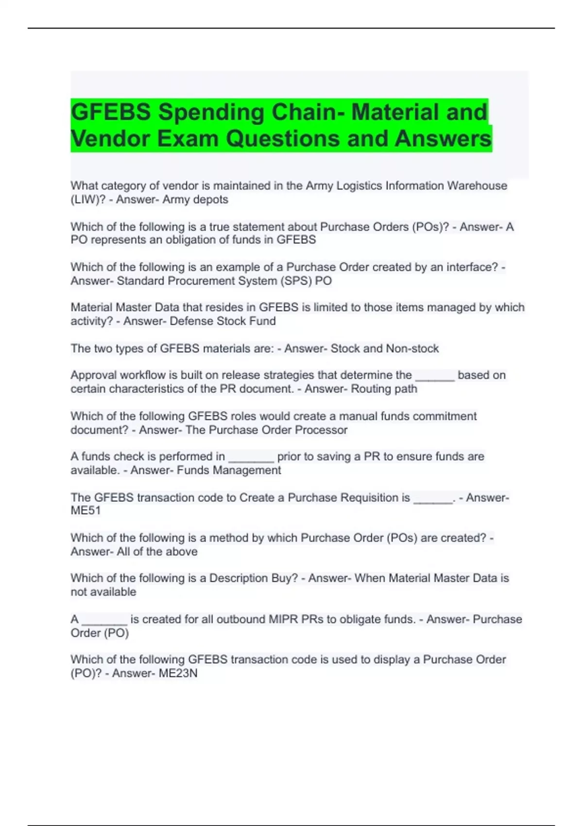 GFEBS Spending Chain- Material and Vendor Exam Questions and Answers