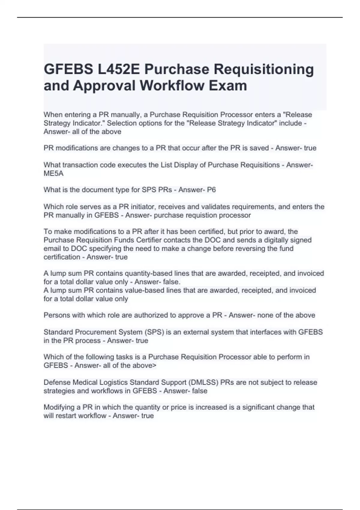 GFEBS L452E Purchase Requisitioning and Approval Workflow Exam 2024