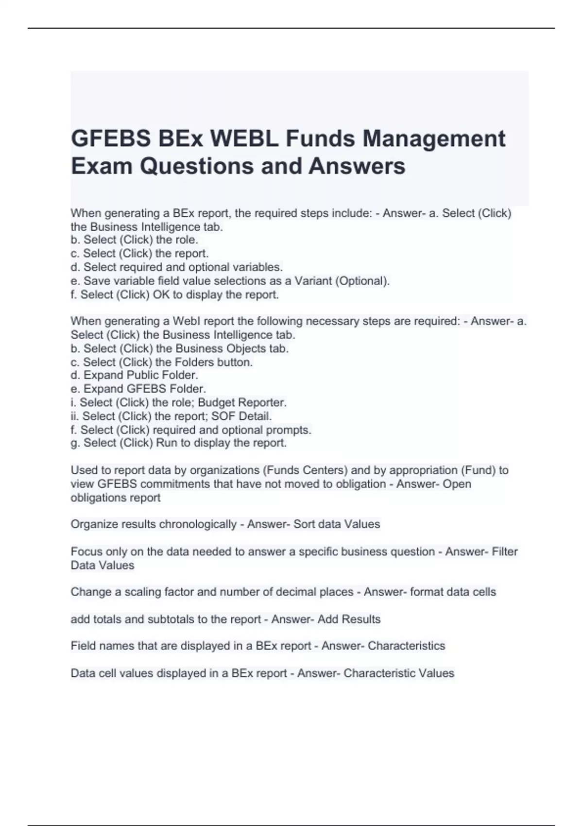 GFEBS BEx WEBL Funds Management Exam Questions and Answers