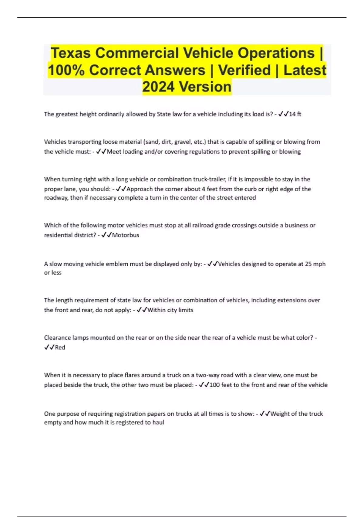 Texas Commercial Vehicle Operations | 100% Correct Answers | Verified | Latest 2024 Version