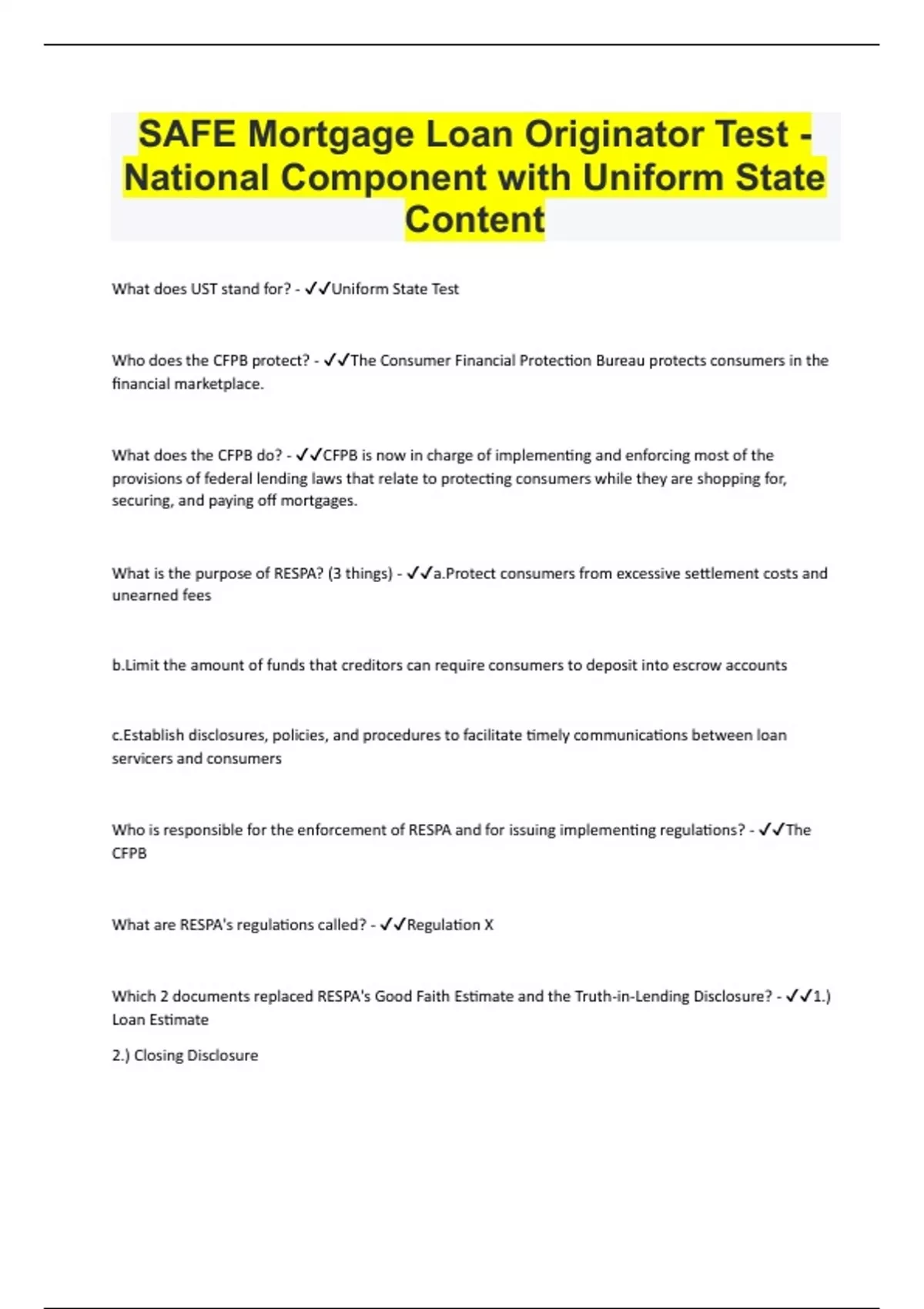 What does UST stand for? - Uniform State Test Who does the CFPB protect? - The Consumer Financial Protection Bureau protects consumers in the financial marketplace. What does the CFPB do? - CFPB is now in charge of implementing and enforcing most of the provisions of federal lending laws that relate to protecting consumers while they are shopping for, securing, and paying off mortgages. What is the purpose of RESPA? (3 things) - a.Protect consumers from excessive settlement costs and unearned fees b.Limit the amount of funds that creditors can require consumers to deposit into escrow accounts c.Establish disclosures, policies, and procedures to facilitate timely communications between loan servicers and consumers Who is responsible for the enforcement of RESPA and for issuing implementing regulations? - The CFPB