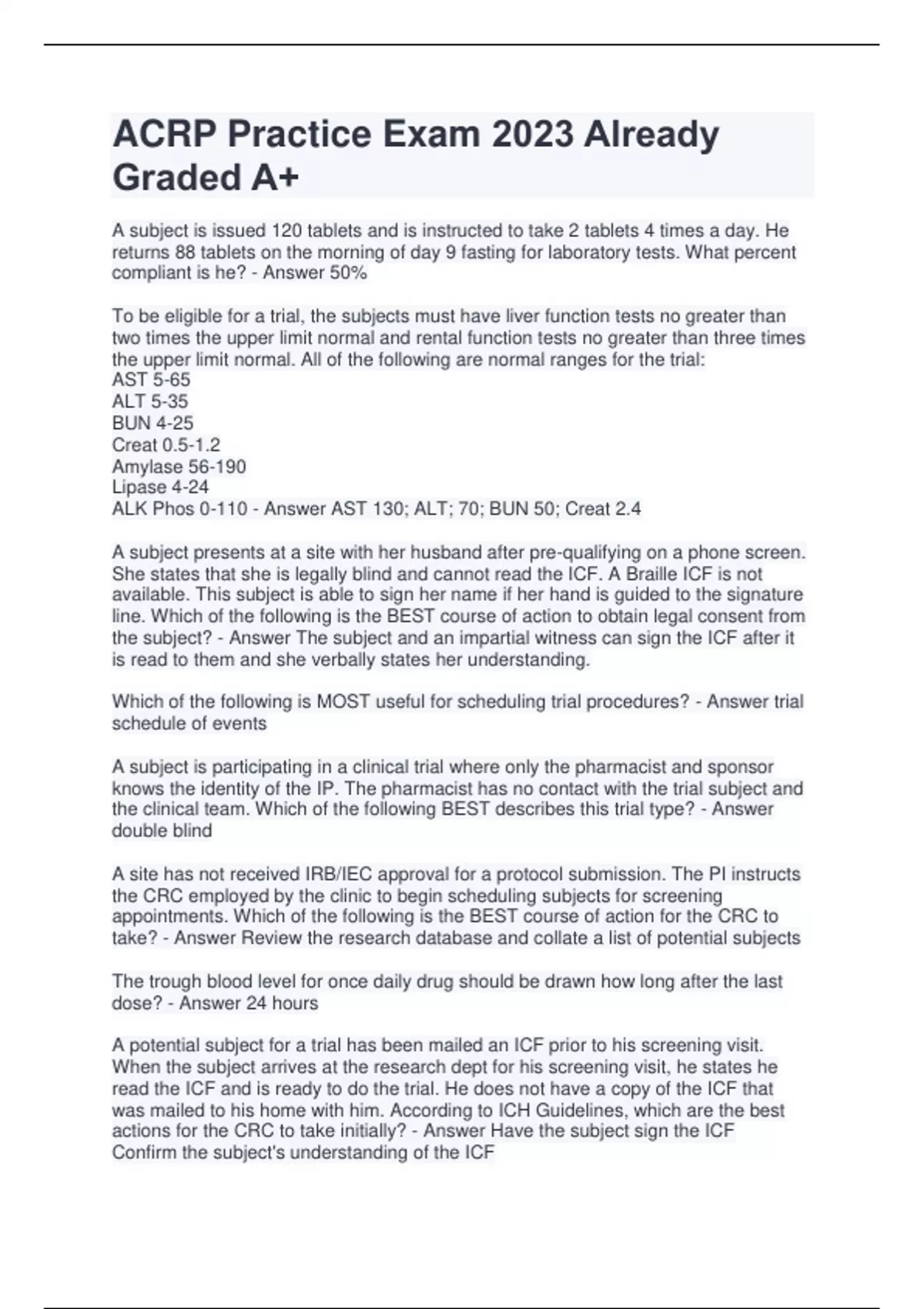 A subject is issued 120 tablets and is instructed to take 2 tablets 4 times a day. He returns 88 tablets on the morning of day 9 fasting for laboratory tests. What percent compliant is he? - Answer 50% To be eligible for a trial, the subjects must have liver function tests no greater than two times the upper limit normal and rental function tests no greater than three times the upper limit normal. All of the following are normal ranges for the trial: AST 5-65 ALT 5-35 BUN 4-25 Creat 0.5-1.2 Amylase 56-190 Lipase 4-24 ALK Phos 0-110 - Answer AST 130; ALT; 70; BUN 50; Creat 2.4 A subject presents at a site with her husband after pre-qualifying on a phone screen. She states that she is legally blind and cannot read the ICF. A Braille ICF is not available. This subject is able to sign her name if her hand is guided to the signature line. Which of the following is the BEST course of action to obtain legal consent from the subject? - Answer The subject and an impartial witness can sign the ICF after it is read to them and she verbally states her understanding. Which of the following is MOST useful for scheduling trial procedures? - Answer trial schedule of events A subject is participating in a clinical trial where only the pharmacist and sponsor knows the identity of the IP. The pharmacist has no contact with the trial subject and the clinical team. Which of the following BEST describes this trial type? - Answer double blind A site has not received IRB/IEC approval for a protocol submission. The PI instructs the CRC employed by the clinic to begin scheduling subjects for screening appointments. Which of the following is the BEST course of action for the CRC to take? - Answer Review the research database and collate a list of potential subjects The trough blood level for once daily drug should b