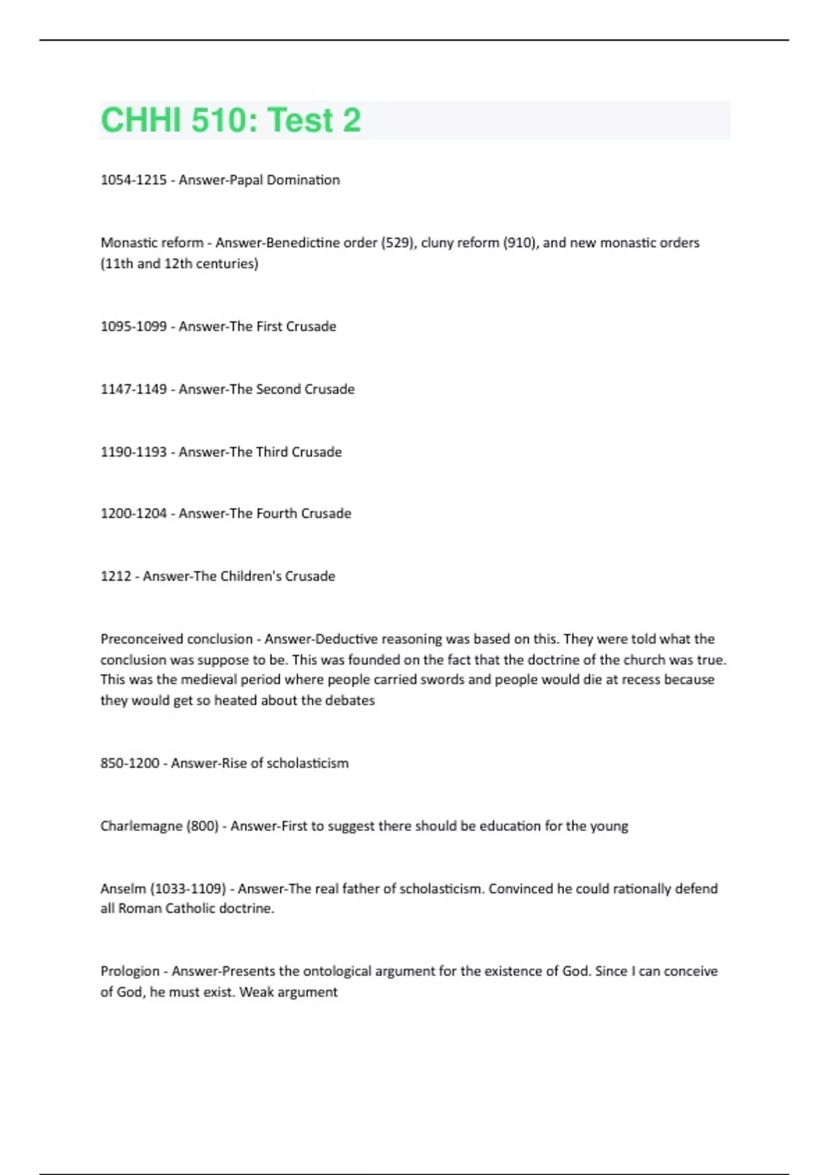 - Answer-Papal Domination Monastic reform - Answer-Benedictine order (529), cluny reform (910), and new monastic orders (11th and 12th centuries) - Answer-The First Crusade - Answer-The Second Crusade - Answer-The Third Crusade - Answer-The Fourth Crusade 1212 - Answer-The Children's Crusade Preconceived conclusion - Answer-Deductive reasoning was based on this. They were told what the conclusion was suppose to be. This was founded on the fact that the doctrine of the church was true. This was the medieval period where people carried swords and people would die at recess because they would get so heated about the debates 850-1200 - Answer-Rise of scholasticism Charlemagne (800) - Answer-First to suggest there should be education for the young Anselm () - Answer-The real father of scholasticism. Convinced he could rationally defend all Roman Catholic doctrine. Prologion - Answer-Presents the ontological argument for the existence of God. Since I can conceive of God, he must exist. Weak argumentCur Deus Homo - Answer-Why the God man? Created the idea of substitutionary atonement, that Jesus became the God man to be substituted for us Peter Abelard () - Answer-Monk, but he was a rascal. He loved to debate his teachers. When he was a teacher he became popular. Met Helueese and they became lovers. He convinced her not to marry because it would be bad for his job. Her uncle castrated him and they stayed lovers. Sic et Non - Answer-Yes and no. 108 contradictions between the Scriptures and what the fathers said. As a result, some of Abelards students became evangelical teachers Peter Lombard () - Answer-Four books of sentences. Sentences of theological truth which people were to learn if they wanted to learn theology. The theological textbook for the medieval church. Not good because it was deductive reasoning. Thomas Aquinas () - Answer-Many of his teachings became the official teachings of the medieval church and even on to modern catholic times. The most influential of all the scholastics. Wrote commentary on Four Books of Sentences which make it finally make sense. Wrote Summa Contra Gentiles to the gentiles (unbelievers) which now included the Jews. Wrote Summa Theologiae which was the greatest work of that day. Came up with the 7 sacraments Baptism - Answer-Water used on baby 8 days old. Washes away taint of original sin Confirmation - Answer-Usually about the time puberty was reached around 11 or 12. Priest administers water again and prays over him. Child assumes responsibility of his faith. Mass - Answer-Qualified to take part of this after confirmation Confession - Answer-Come to confessional booth and talk to priest. To be done regularly