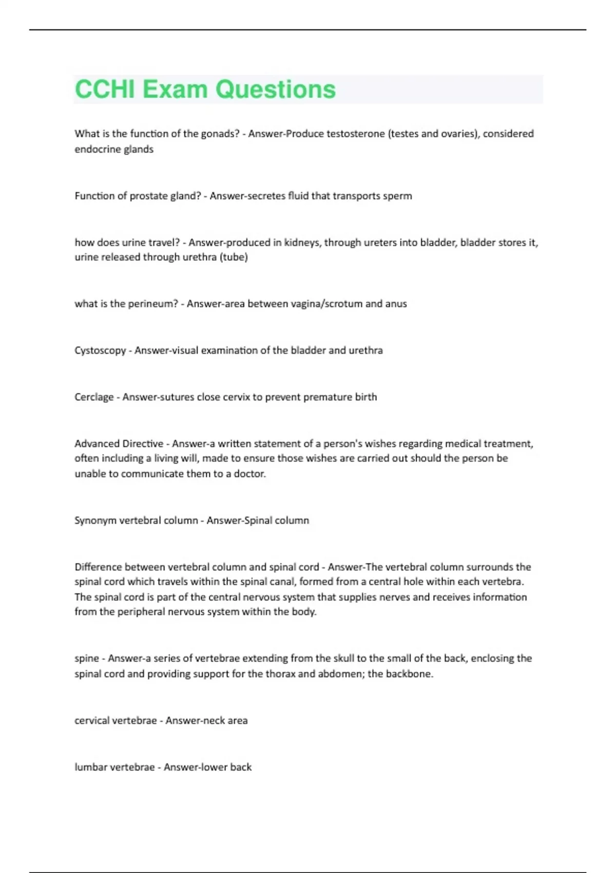What is the function of the gonads? - Answer-Produce testosterone (testes and ovaries), considered endocrine glands Function of prostate gland? - Answer-secretes fluid that transports sperm how does urine travel? - Answer-produced in kidneys, through ureters into bladder, bladder stores it, urine released through urethra (tube) what is the perineum? - Answer-area between vagina/scrotum and anus Cystoscopy - Answer-visual examination of the bladder and urethra Cerclage - Answer-sutures close cervix to prevent premature birth Advanced Directive - Answer-a written statement of a person's wishes regarding medical treatment, often including a living will, made to ensure those wishes are carried out should the person be unable to communicate them to a doctor. Synonym vertebral column - Answer-Spinal column Difference between vertebral column and spinal cord - Answer-The vertebral column surrounds the spinal cord which travels within the spinal canal, formed from a central hole within each vertebra. The spinal cord is part of the central nervous system that supplies nerves and receives information from the peripheral nervous system within the body. spine - Answer-a series of vertebrae extending from the skull to the small of the back, enclosing the spinal cord and providing support for the thorax and abdomen; the backbone. cervical vertebrae - Answer-neck area lumbar vertebrae - Answer-lower backsynonym for vertebral column - Answer-spine Optic neuritis - Answer-swelling (inflammation) damages the optic nerve Acute anterior uveitis - Answer-acute inflammation of the retina Blepharitis - Answer-inflammation of the eyelid astigmatism - Answer-anatomical malformation of cornea or lens myopia - Answer-images come to a focus in front of the retina of the eye because of defects in the refractive media of the eye or of abnormal length of the eyeball An echocardiogram is done by - Answer-Placing an ultrasound transducer on the patient's chest what is Dyspnea - Answer-shortness of breath why do you place electrodes on patient's skin? - Answer-to measure electrical activity of the heart for an EKG (electrocardiogram) when do you inject patients with contrast dyes? - Answer-X-ray, CT, MRI, or ultrasound exam. Can be an iodine-based material, barium-sulfate, gadolinium, or saline and air mixture (swallowed or injected intravenously) why swallow barium solution? - Answer-to obtain contrast X-ray studies of the digestive tube (e.g. esophagram) drug toxicity symptom - Answer-loss of hearing, seizures, digestive issues