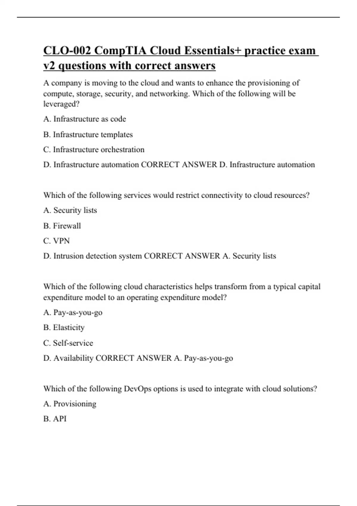 CLO-002 CompTIA Cloud Essentials+ practice exam v2 questions with correct answers
