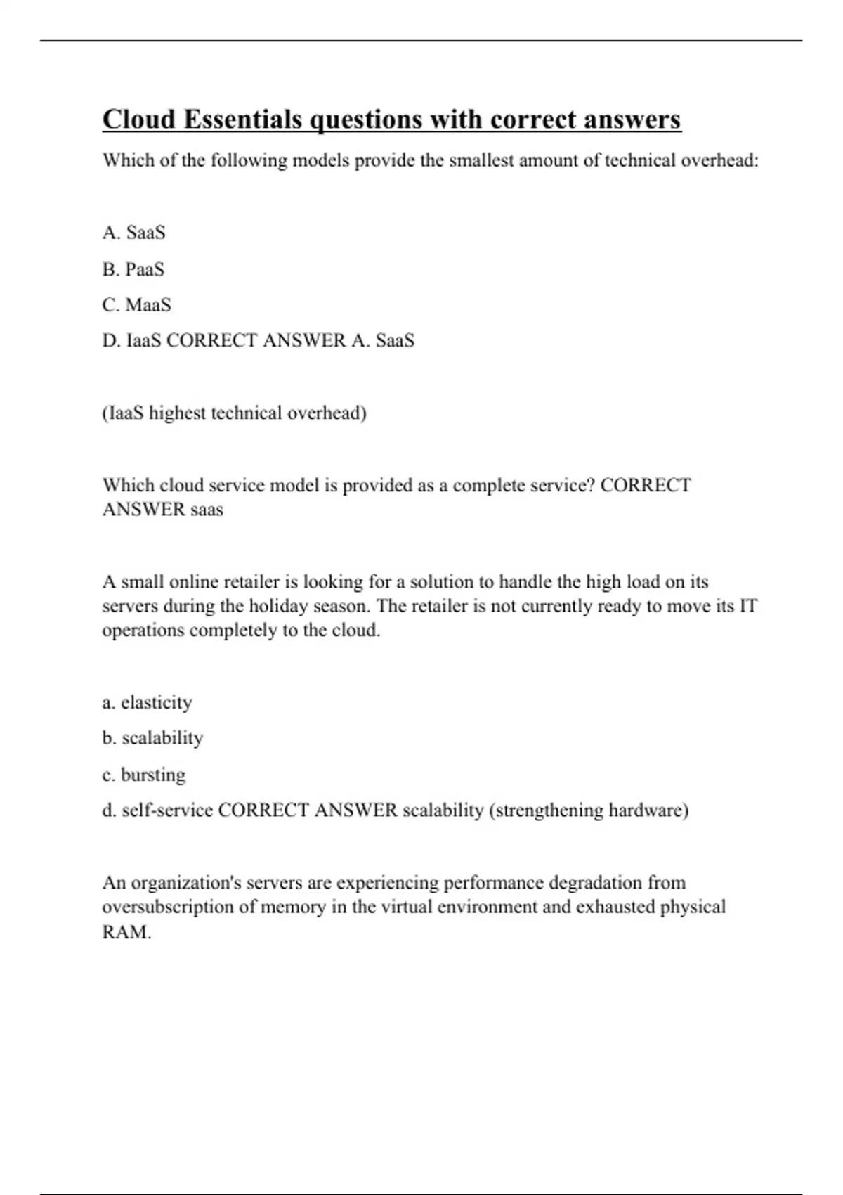 Which of the following models provide the smallest amount of technical overhead: A. SaaS B. PaaS C. MaaS D. IaaS CORRECT ANSWER A. SaaS (IaaS highest technical overhead) Which cloud service model is provided as a complete service? CORRECT ANSWER saas A small online retailer is looking for a solution to handle the high load on its servers during the holiday season. The retailer is not currently ready to move its IT operations completely to the cloud. a. elasticity b. scalability c. bursting d. self-service CORRECT ANSWER scalability (strengthening hardware) An organization's servers are experiencing performance degradation from oversubscription of memory in the virtual environment and exhausted physical RAM.