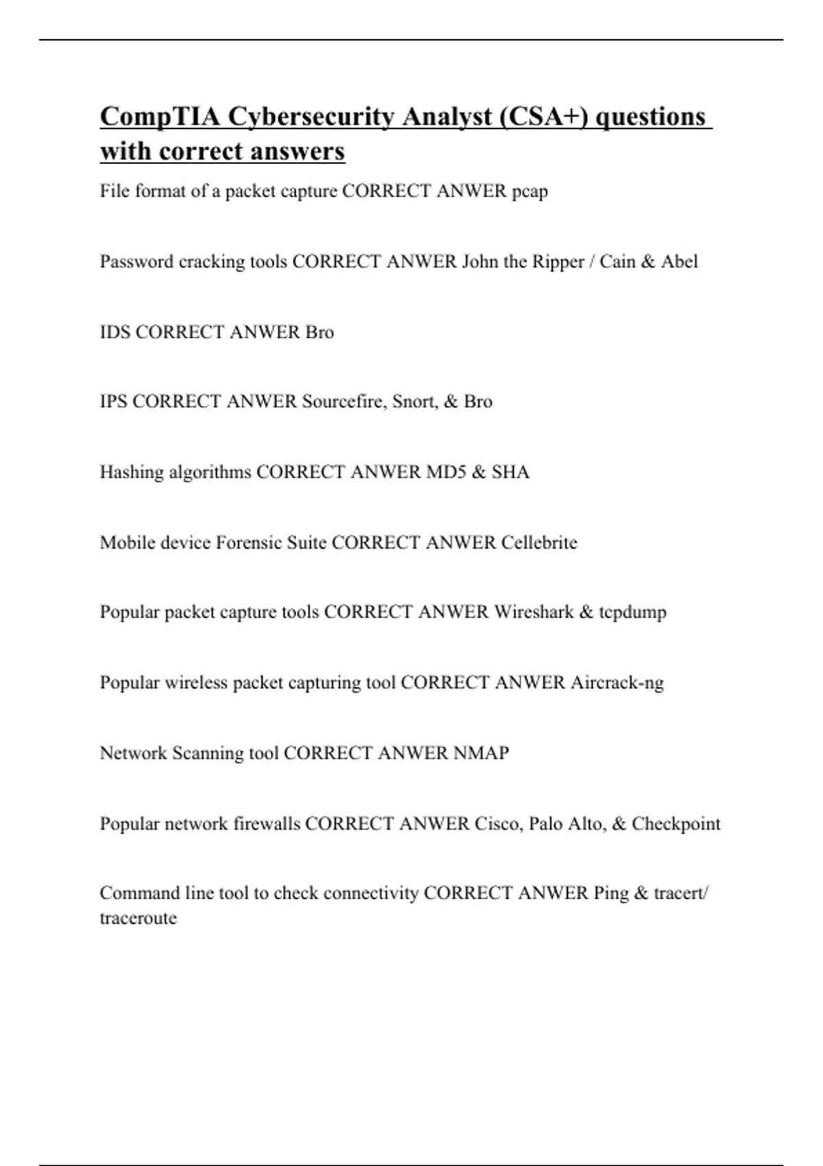 File format of a packet capture CORRECT ANWER pcap Password cracking tools CORRECT ANWER John the Ripper / Cain & Abel IDS CORRECT ANWER Bro IPS CORRECT ANWER Sourcefire, Snort, & Bro Hashing algorithms CORRECT ANWER MD5 & SHA Mobile device Forensic Suite CORRECT ANWER Cellebrite Popular packet capture tools CORRECT ANWER Wireshark & tcpdump Popular wireless packet capturing tool CORRECT ANWER Aircrack-ng Network Scanning tool CORRECT ANWER NMAP Popular network firewalls CORRECT ANWER Cisco, Palo Alto, & Checkpoint Command line tool to check connectivity CORRECT ANWER Ping & tracert/ traceroute