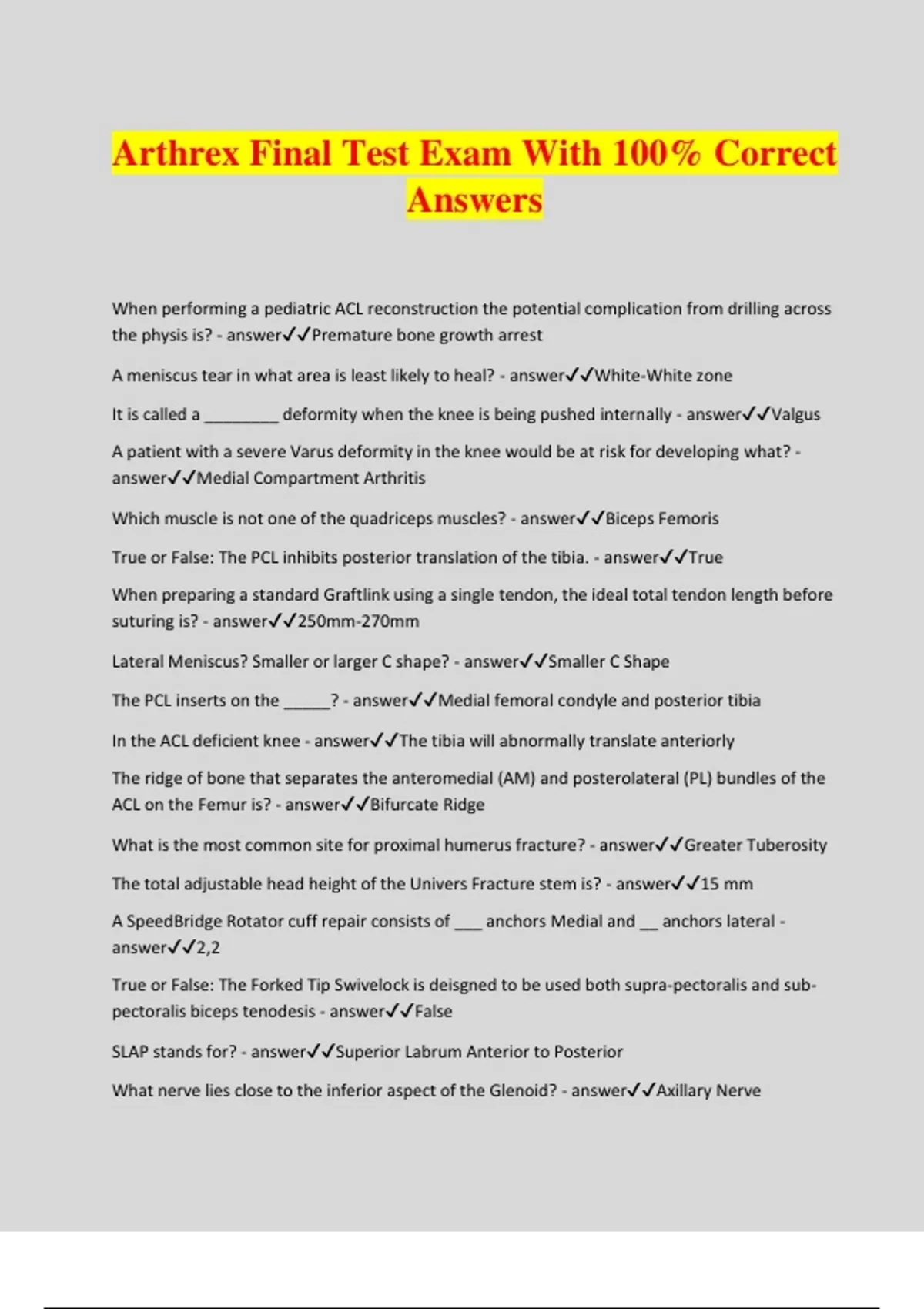 Arthrex Final Test Exam With 100% Correct Answers When performing a pediatric ACL reconstruction the potential complication from drilling across the physis is? - answerPremature bone growth arrest A meniscus tear in what area is least likely to heal? - answerWhite-White zone It is called a ________ deformity when the knee is being pushed internally - answerValgus A patient with a severe Varus deformity in the knee would be at risk for developing what? - answerMedial Compartment Arthritis Which muscle is not one of the quadriceps muscles? - answerBiceps Femoris True or False: The PCL inhibits posterior translation of the tibia. - answerTrue When preparing a standard Graftlink using a single tendon, the ideal total tendon length before suturing is? - answer250mm-270mm Lateral Meniscus? Smaller or larger C shape? - answerSmaller C Shape The PCL inserts on the _____? - answerMedial femoral condyle and posterior tibia In the ACL deficient knee - answerThe tibia will abnormally translate anteriorly The ridge of bone that separates the anteromedial (AM) and posterolateral (PL) bundles of the ACL on the Femur is? - answerBifurcate Ridge What is the most common site for proximal humerus fracture? - answerGreater Tuberosity The total adjustable head height of the Univers Fracture stem is? - answer15 mm A SpeedBridge Rotator cuff repair consists of ___ anchors Medial and __ anchors lateral - answer2,2 True or False: The Forked Tip Swivelock is deisgned to be used both supra-pectoralis and sub- pectoralis biceps tenodesis - answerFalse SLAP stands for? - answerSuperior Labrum Anterior to Posterior What nerve lies close to the inferior aspect of the Glenoid? - answerAxillary Nerve