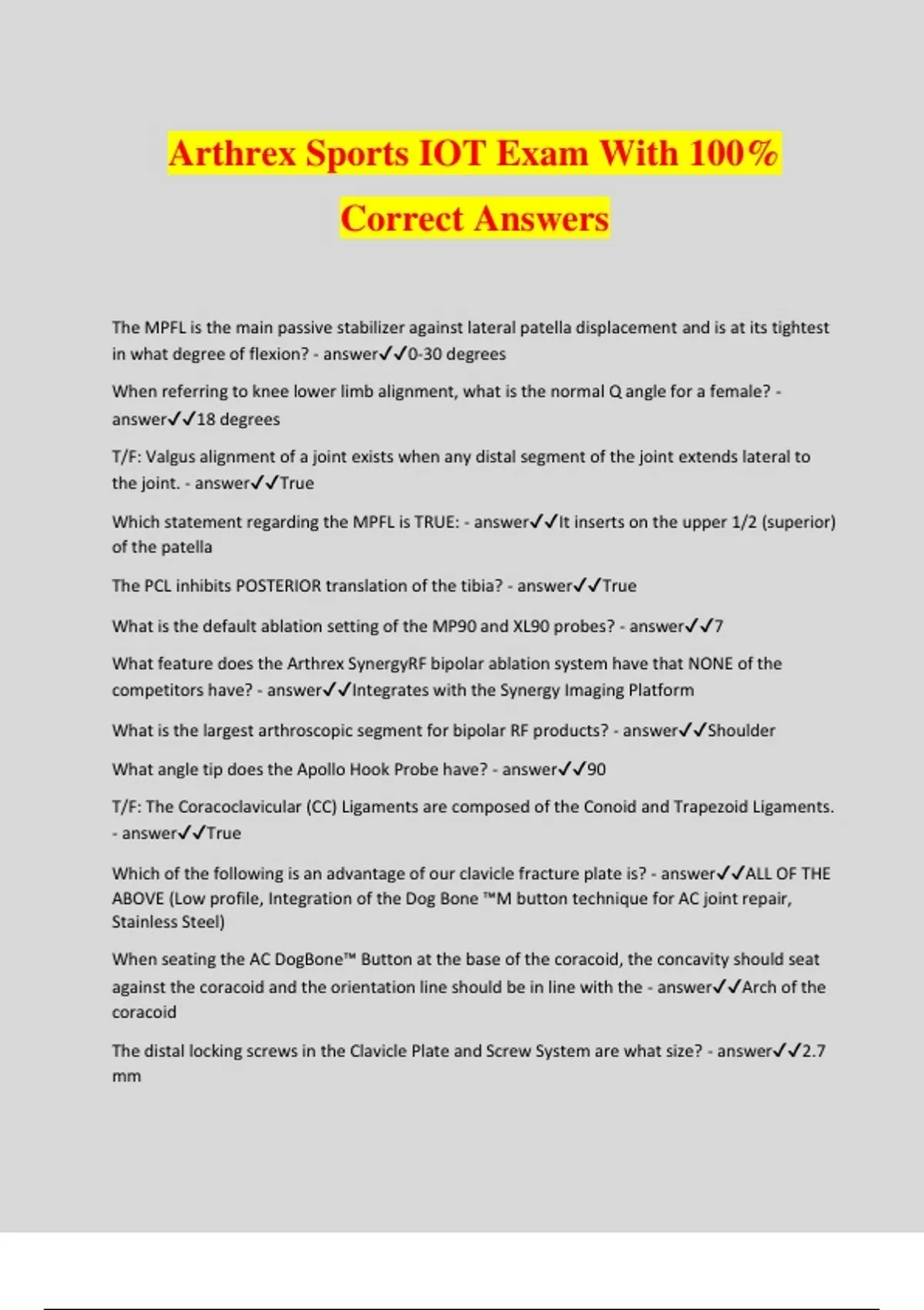Arthrex Sports IOT Exam With 100% Correct Answers The MPFL is the main passive stabilizer against lateral patella displacement and is at its tightest in what degree of flexion? - answer0-30 degrees When referring to knee lower limb alignment, what is the normal Q angle for a female? - answer18 degrees T/F: Valgus alignment of a joint exists when any distal segment of the joint extends lateral to the joint. - answerTrue Which statement regarding the MPFL is TRUE: - answerIt inserts on the upper 1/2 (superior) of the patella The PCL inhibits POSTERIOR translation of the tibia? - answerTrue What is the default ablation setting of the MP90 and XL90 probes? - answer7 What feature does the Arthrex SynergyRF bipolar ablation system have that NONE of the competitors have? - answerIntegrates with the Synergy Imaging Platform What is the largest arthroscopic segment for bipolar RF products? - answerShoulder What angle tip does the Apollo Hook Probe have? - answer90 T/F: The Coracoclavicular (CC) Ligaments are composed of the Conoid and Trapezoid Ligaments. - answerTrue Which of the following is an advantage of our clavicle fracture plate is? - answerALL OF THE ABOVE (Low profile, Integration of the Dog Bone ™M button technique for AC joint repair, Stainless Steel) When seating the AC DogBone™ Button at the base of the coracoid, the concavity should seat against the coracoid and the orientation line should be in line with the - answerArch of the coracoid The distal locking screws in the Clavicle Plate and Screw System are what size? - answer2.7 mm Which nerve needs to be identified during UCL reconstruction? - answerMedial antebrachial cutaneous nerve What is the necessary graft length when performing an Elbow UCL Reconstruction? - answer15-17 cm During an Ulnar Collateral Ligament Reconstruction, which portion of the ligament is reconstructed? - answerAnterior What is the shelf life of Arthrex Amnion™ Matrix? - answer5 years What was the main objective in the development of the InternalBrace™ implant? - answerALL OF THE ABOVE (biocompatability, biomechanically adequate to encourage healing without replacing ligament, quick recovery and safer mobility, no need for casting) The PowerPick™ instrument was initially designed to make quick work of: - answerMicrofracture procedures T/F: The origin of the ALL is near the lateral epicondyle and the insertion point is halfway between Gerdy's tubercle and the fibular head. - answerTrue According to the Surgical Technique Guide, the tibial 2.4 mm guide pin should be placed ______ posterior to Gerdy's tubercle and _________ distal to the joint line. - answer22mm, 10mm The Anterolateral Ligament (ALL) of the knee mimics the course of which structure? - answerIT Band T/F: The ALL is found to act as an important restraint to external rotation of the tibia. - answerFalse (internal) What is the most common site for a proximal humerus fracture? - answerSurgical Neck What nerve lies close to the inferior aspect of the Glenoid? - answerAxillary nerve Which of the following are benefits of the Humeral SuturePlate for proximal humeral fractures? - answerALL OF THE ABOVE (anatomic design, low profile, chamfered suture eyelets for FiberWire suture) What size FiberWire® suture is found in the 2mm SutureTaks? - answer#1 FiberWire suture The Knotless SutureTak includes what type of suture? - answer#2 Coreless FiberWire suture The "RINSE" feature of the DualWave Pump increases the suction rate of which suction structure? - answerCannula To deactivate the DualWave™ Pump ASP Mode should the shaver be activated or deactivated before the rinse mode button on the remote or the foot petal is pressed. - answerActivate