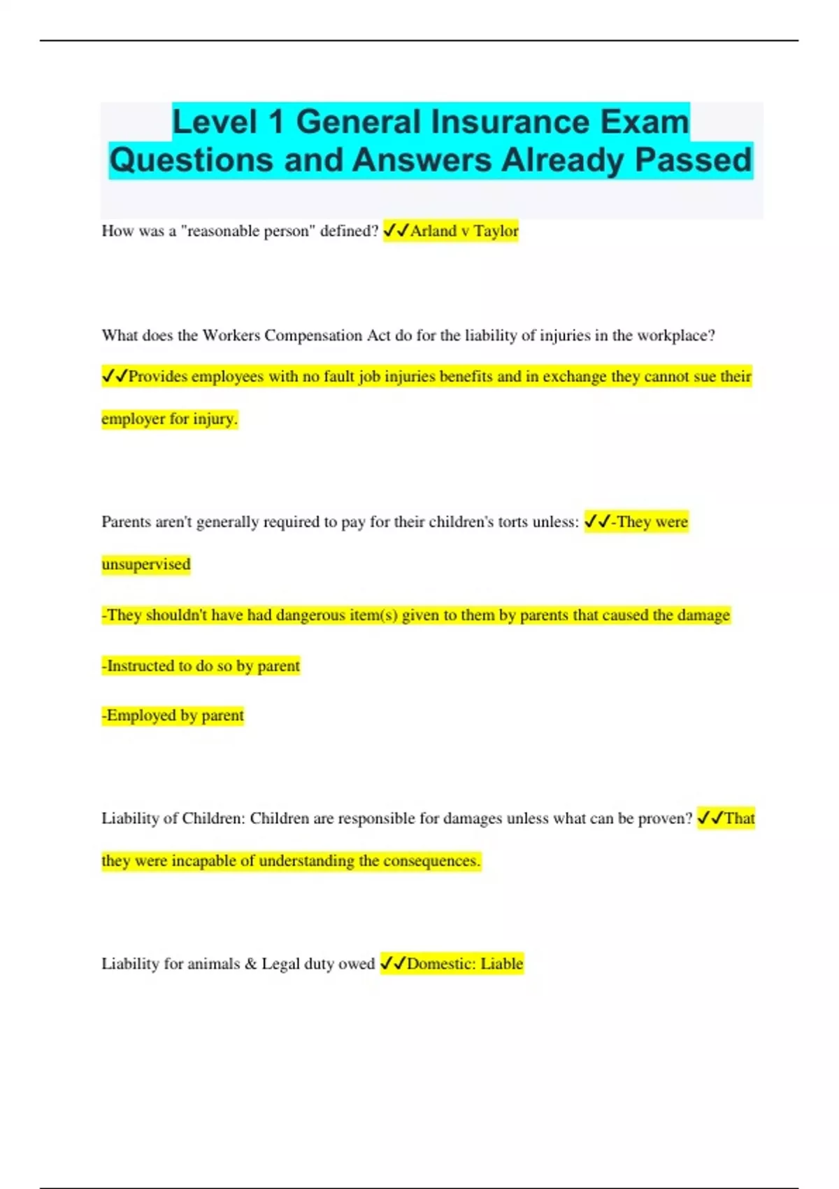 Level 1 General Insurance Exam Questions and Answers Already Passed How was a "reasonable person" defined? Arland v Taylor What does the Workers Compensation Act do for the liability of injuries in the workplace? Provides employees with no fault job injuries benefits and in exchange they cannot sue their employer for injury. Parents aren't generally required to pay for their children's torts unless: -They were unsupervised -They shouldn't have had dangerous item(s) given to them by parents that caused the damage -Instructed to do so by parent -Employed by parent Liability of Children: Children are responsible for damages unless what can be proven? That they were incapable of understanding the consequences. Liability for animals & Legal duty owed Domestic: Liable Wild: If it is common knowledge that animal is dangerous, they are held strictly liable for any damage/injury. What happens if equal liability is disputed? The law holds both tortfeaser's liable for the entirety of the award. Invitee & Occupier's legal duty owed -Not in AB, BC, ON, NS Enters by expressed or implied invitation, or connected w/ business or activity conducted on property. OR has financial/material interest in the property. -Must protect invitee's from not only known dangers, but also those which with reasonable care he might discover. Tortfeaser/Joint tortfeasers -The person who commits a wrong (tort) against an innocent party. - If 2 or more, referred to as joint tortfeasers What are the 4 sanction levels? 0/-3 = +6 -4/-8 = +5 -8/-15 = +4 -15/-20 = +3 Limited Depreciation Coverage -First 3 model years -If damage is considered a "total loss" (write off), insured receives the value of the vehicle when purchased. -Cash payout is only option What are the exceptions of limited depreciation coverage? Claim mode for loss due to: -Fire -Theft -Vandalism -Malicious mischief What are the 3 types of newer vehicle protection? -Enhanced replacement cost coverage -Replacement cost coverage -Limited depreciation coverage Enhanced Replacement cost