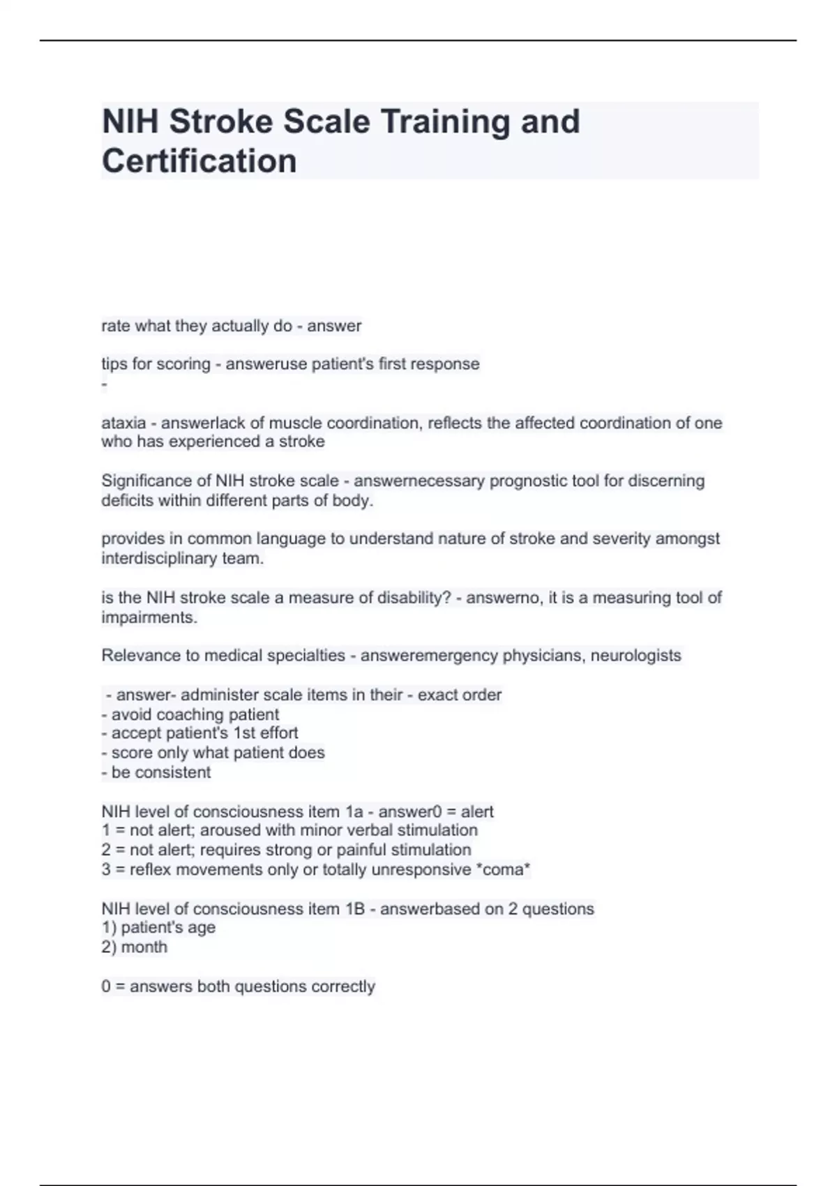 NIH Stroke Scale Training and Certification Questions and Answers 2024