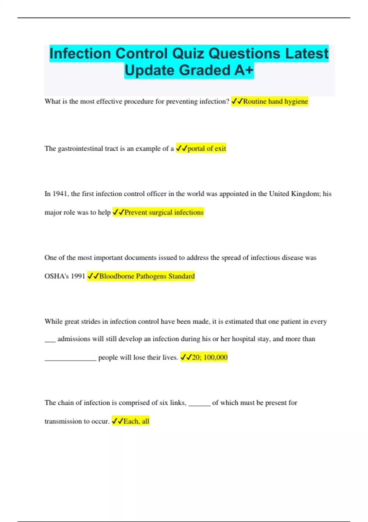 Infection Control Quiz Questions Latest Update Graded A+ What is the most effective procedure for preventing infection? Routine hand hygiene The gastrointestinal tract is an example of a portal of exit In 1941, the first infection control officer in the world was appointed in the United Kingdom; his major role was to help Prevent surgical infections One of the most important documents issued to address the spread of infectious disease was OSHA's 1991 Bloodborne Pathogens Standard While great strides in infection control have been made, it is estimated that one patient in every ___ admissions will still develop an infection during his or her hospital stay, and more than ______________ people will lose their lives. 20; 100,000 The chain of infection is comprised of six links, ______ of which must be present for transmission to occur. Each, all In the chain of infection, the _______________ is the environment where the agent reproduces. Reservoir Transmission of the agent from the reservoir to the susceptible host can occur through which routes? Contact, Droplet, Airborne Examples of airborne infections include TB, chicken pox, measles The final link in the chain of infection is the _______________, the person who lacks the ability to resist the pathogen and fight off the infectious process. Susceptible host Multidrug-resistant organisms, or MDROs, are defined as microorganisms, usually _______________, that are resistant to one or more classes of antimicrobial agents. Bacteria The highest incidence of MDROs occurs in intensive care units in tertiary care centers because of: Underlying medical conditions and recent surgeries and indwelling equipment One of the major factors in the surge of MDROs is that for years, physicians have been prescribing antibiotics for colds, influenza, and other viral infections, even though it is well known that these drugs are _____________.