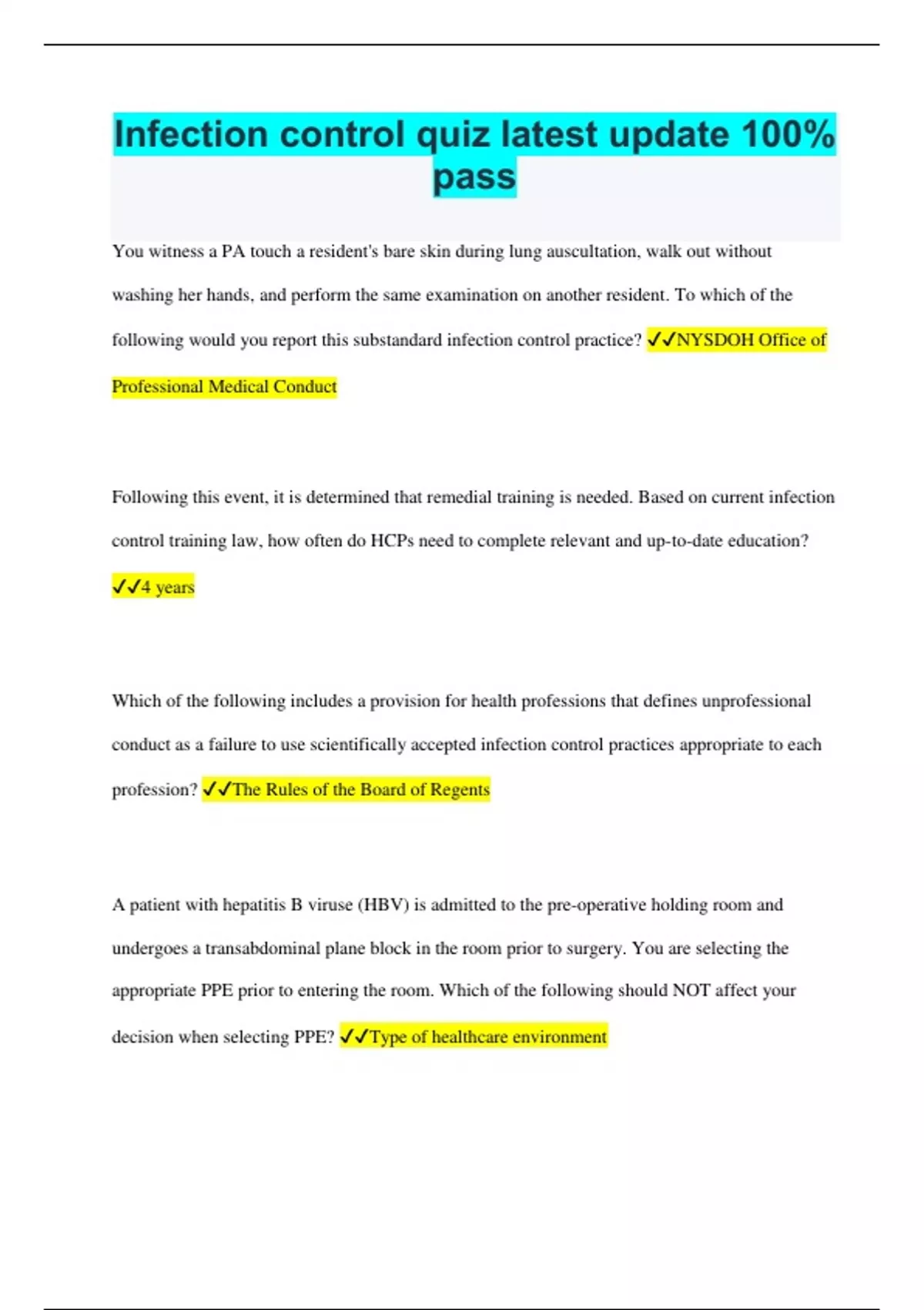 Infection control quiz latest update 100% pass You witness a PA touch a resident's bare skin during lung auscultation, walk out without washing her hands, and perform the same examination on another resident. To which of the following would you report this substandard infection control practice? NYSDOH Office of Professional Medical Conduct Following this event, it is determined that remedial training is needed. Based on current infection control training law, how often do HCPs need to complete relevant and up-to-date education? 4 years Which of the following includes a provision for health professions that defines unprofessional conduct as a failure to use scientifically accepted infection control practices appropriate to each profession? The Rules of the Board of Regents A patient with hepatitis B viruse (HBV) is admitted to the pre-operative holding room and undergoes a transabdominal plane block in the room prior to surgery. You are selecting the appropriate PPE prior to entering the room. Which of the following should NOT affect your decision when selecting PPE? Type of healthcare environment How many days does the HBV remain infectious on environmental surfaces? 7 Following the procedure, the patient leaves for the OR and you call environmental services. Which of the following best describes "the process of removing all foreign material from objects by using detergents or enzymatic products?" cleaning Which of the following are high risk for infection; therefore, the contaminated item must be sterilized? Suture scissors Violating infection control training provisions in New York is considered: Professional misconduct Which of the following is a measure of the severity of the disease? Virulence The infection control training law ensures HCPs complete relevant and up-to-date education every: 4 Which of the following sets of symptoms most closely resembles sepsis? Sweating, shortness of breath, tachycardia Respiratory and anesthesia equipment are examples of: Semi-critical items A mode of transmission for pathogens suspended in the air for a long time is: Airborne transmission Employees who refuse the HBV vaccine