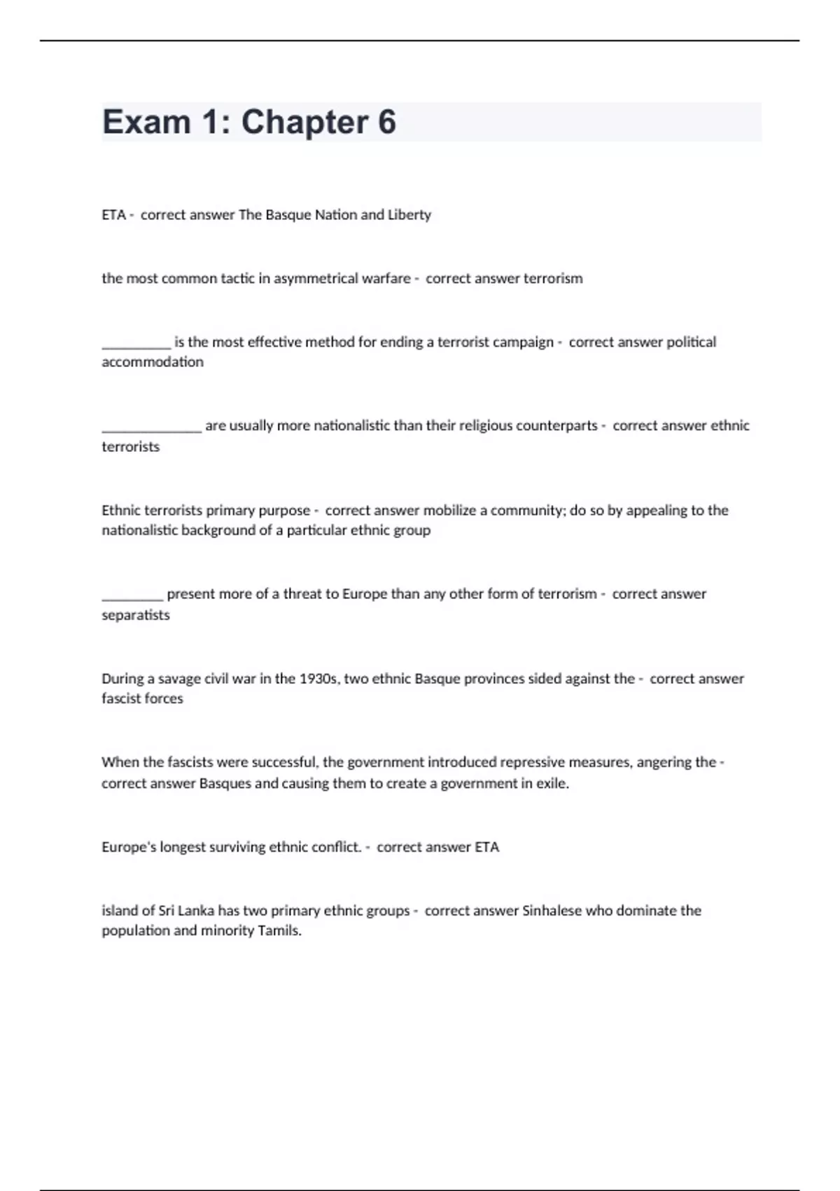 Exam 1: Chapter 6ETA - correct answer The Basque Nation and Liberty the most common tactic in asymmetrical warfare - correct answer terrorism _________ is the most effective method for ending a terrorist campaign - correct answer political accommodation _____________ are usually more nationalistic than their religious counterparts - correct answer ethnic terrorists Ethnic terrorists primary purpose - correct answer mobilize a community; do so by appealing to the nationalistic background of a particular ethnic group ________ present more of a threat to Europe than any other form of terrorism - correct answer separatists During a savage civil war in the 1930s, two ethnic Basque provinces sided against the - correct answer fascist forces When the fascists were successful, the government introduced repressive measures, angering the - correct answer Basques and causing them to create a government in exile. Europe's longest surviving ethnic conflict. - correct answer ETA island of Sri Lanka has two primary ethnic groups - correct answer Sinhalese who dominate the population and minority Tamils.