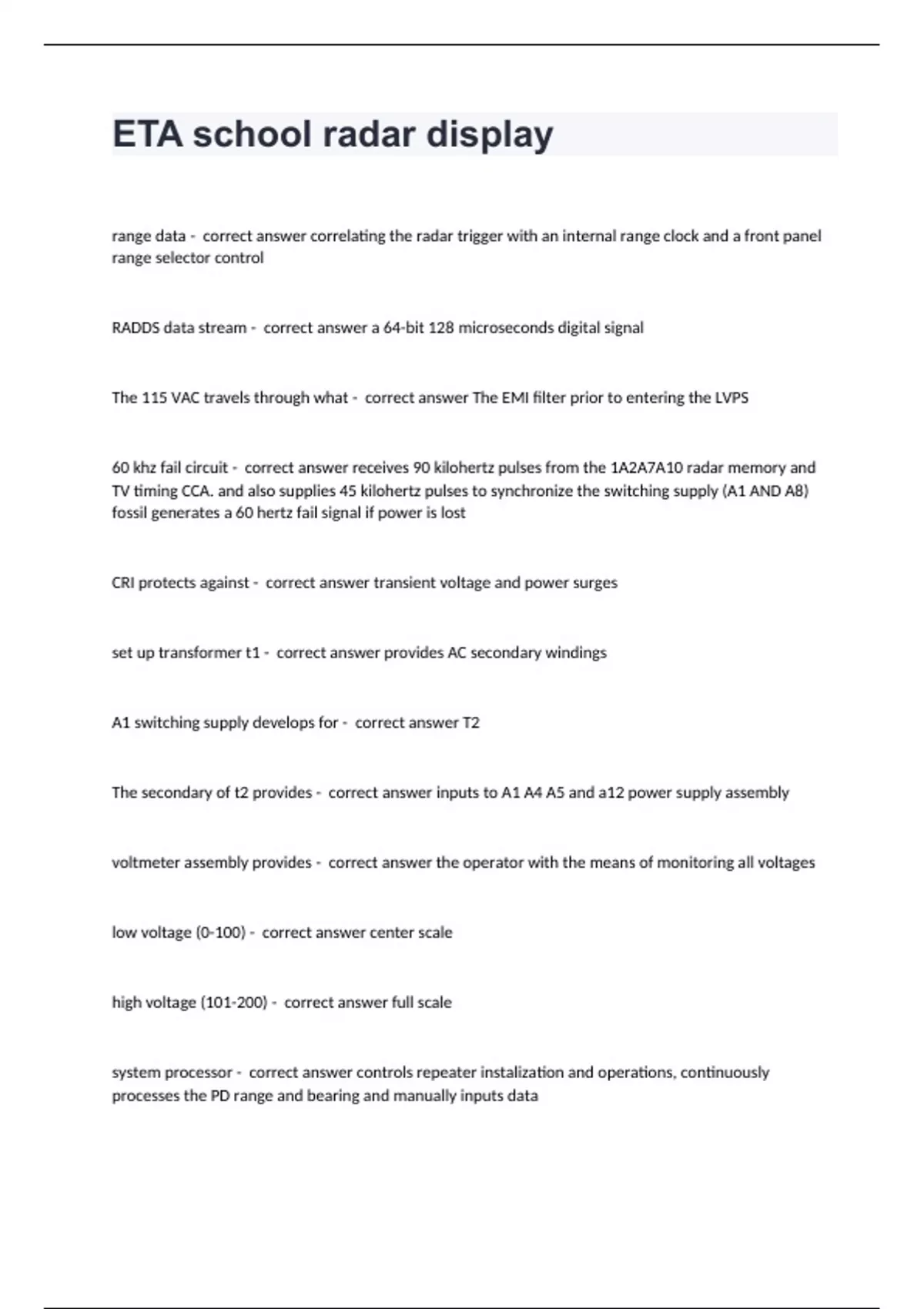 ETA school radar displayrange data - correct answer correlating the radar trigger with an internal range clock and a front panel range selector control RADDS data stream - correct answer a 64-bit 128 microseconds digital signal The 115 VAC travels through what - correct answer The EMI filter prior to entering the LVPS 60 khz fail circuit - correct answer receives 90 kilohertz pulses from the 1A2A7A10 radar memory and TV timing CCA. and also supplies 45 kilohertz pulses to synchronize the switching supply (A1 AND A8) fossil generates a 60 hertz fail signal if power is lost CRI protects against - correct answer transient voltage and power surges set up transformer t1 - correct answer provides AC secondary windings A1 switching supply develops for - correct answer T2 The secondary of t2 provides - correct answer inputs to A1 A4 A5 and a12 power supply assembly voltmeter assembly provides - correct answer the operator with the means of monitoring all voltages low voltage (0-100) - correct answer center scale high voltage (101-200) - correct answer full scale system processor - correct answer controls repeater instalization and operations, continuously processes the PD range and bearing and manually inputs data