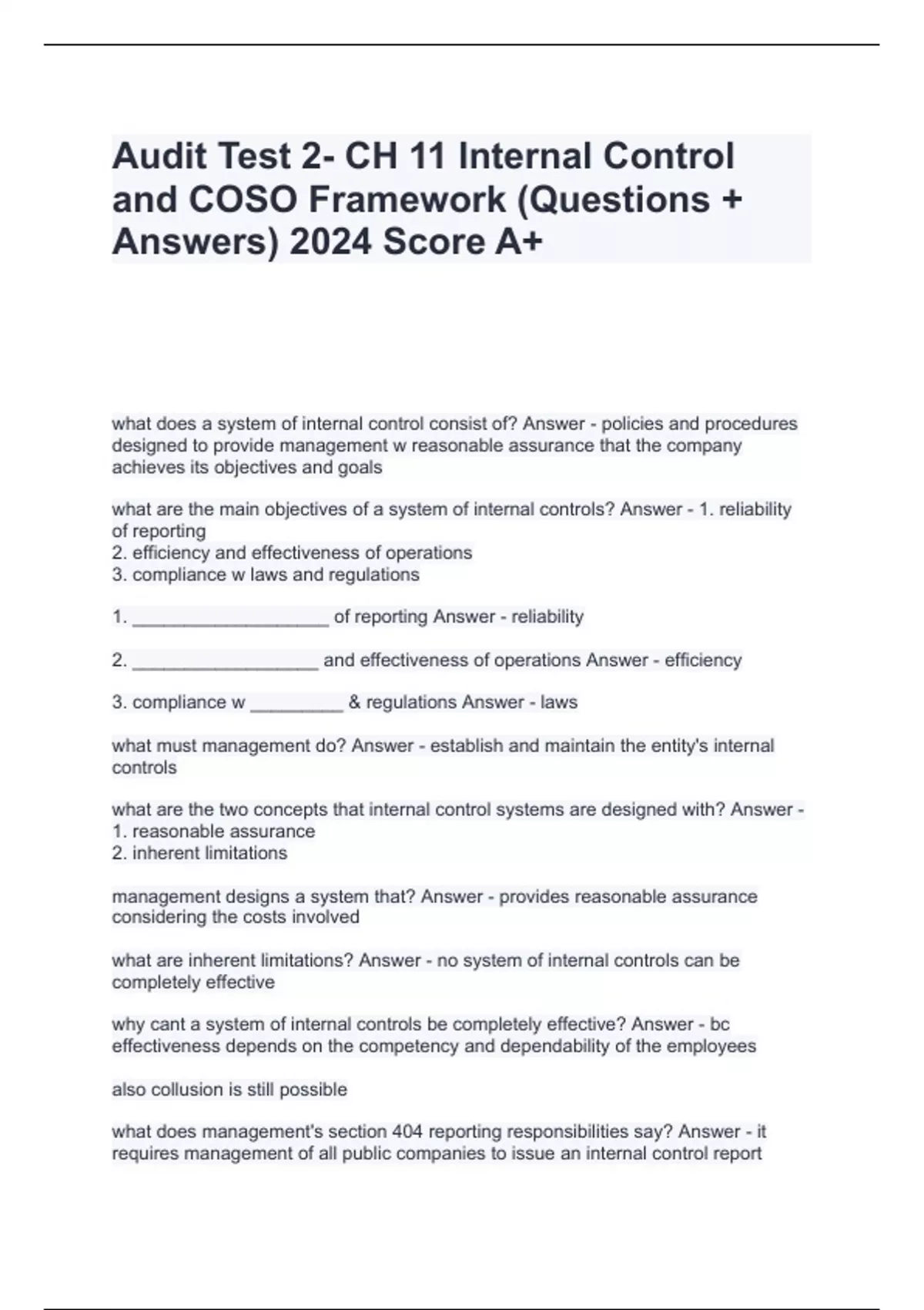 Audit Test 2- CH 11 Internal Control and COSO Framework (Questions + Answers) 2024 Score A+