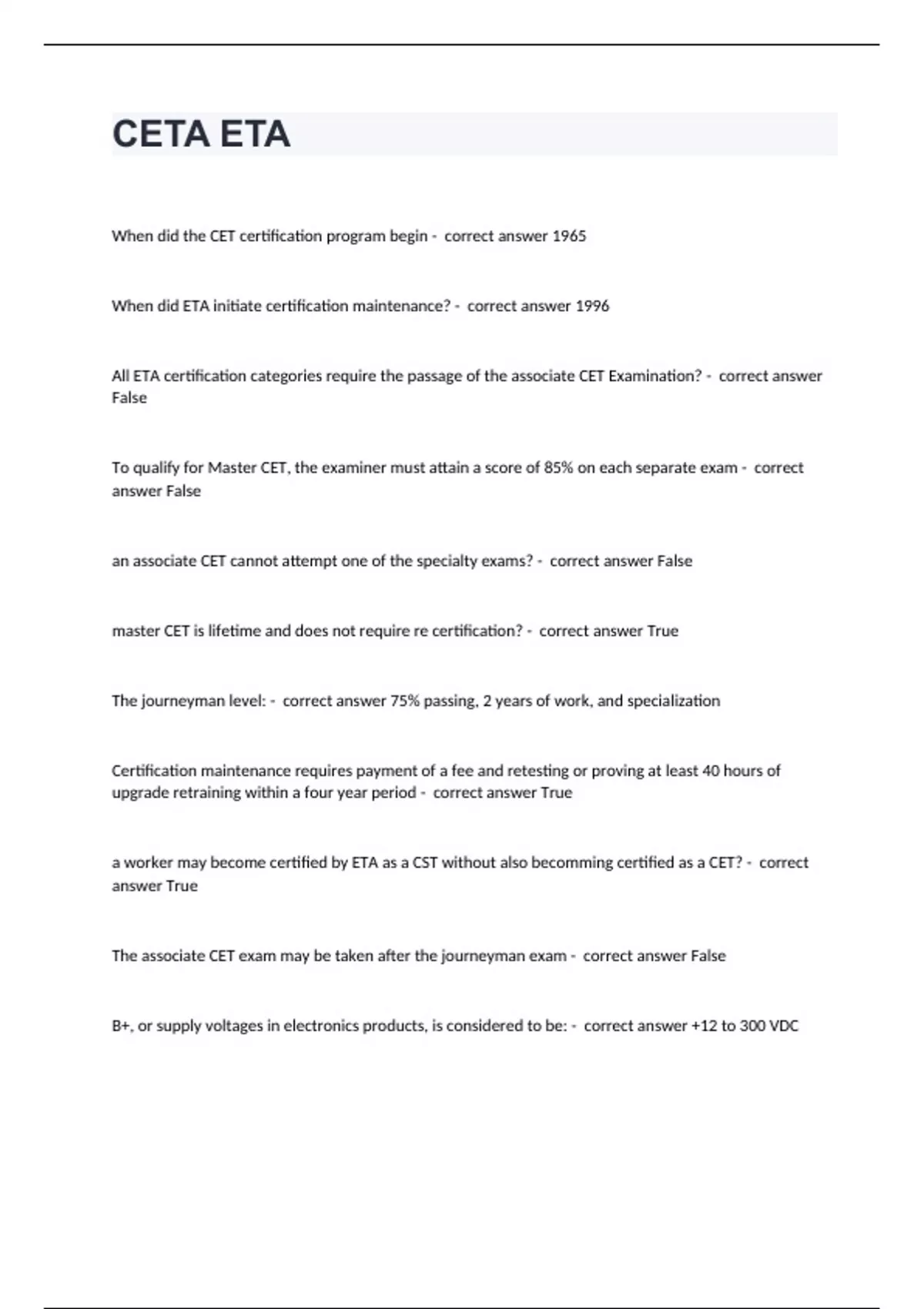 CETA ETAWhen did the CET certification program begin - correct answer 1965 When did ETA initiate certification maintenance? - correct answer 1996 All ETA certification categories require the passage of the associate CET Examination? - correct answer False To qualify for Master CET, the examiner must attain a score of 85% on each separate exam - correct answer False an associate CET cannot attempt one of the specialty exams? - correct answer False master CET is lifetime and does not require re certification? - correct answer True The journeyman level: - correct answer 75% passing, 2 years of work, and specialization Certification maintenance requires payment of a fee and retesting or proving at least 40 hours of upgrade retraining within a four year period - correct answer True a worker may become certified by ETA as a CST without also becomming certified as a CET? - correct answer True The associate CET exam may be taken after the journeyman exam - correct answer False B+, or supply voltages in electronics products, is considered to be: - correct answer +12 to 300 VDC