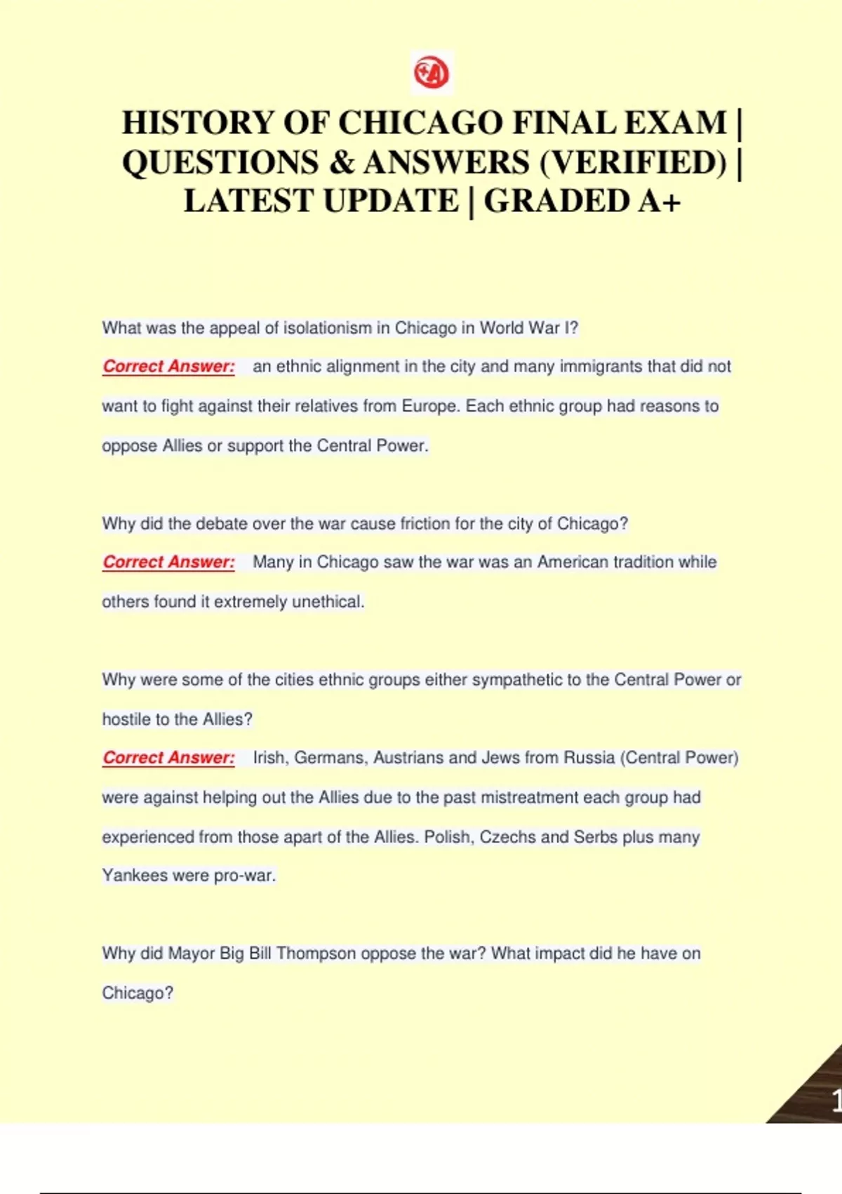 HISTORY OF CHICAGO FINAL EXAM | QUESTIONS & ANSWERS (VERIFIED) | LATEST UPDATE | GRADED A+